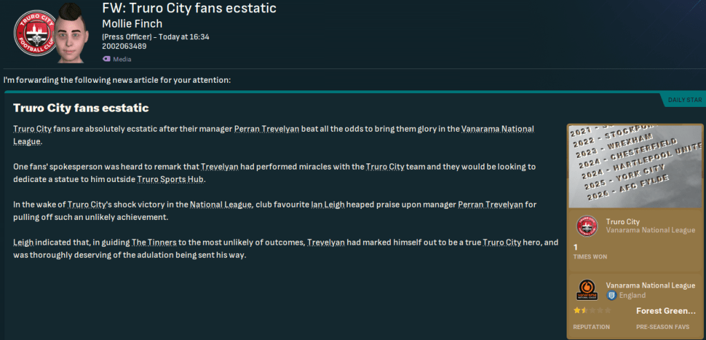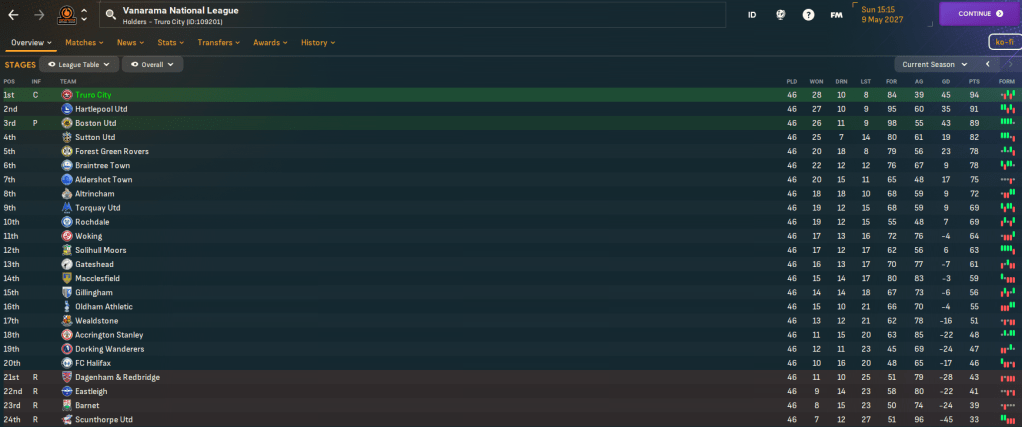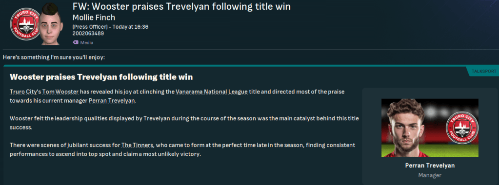 Truro won the title by 3 points, finishing on 94 points after 28 wins, 10 draws and 8 defats, scoring 84 and conceding just 39. Jadenm was the 4th-top scorer with 18 in 45 and Wooster had the 3rd-most clean sheets with 15. League favourites Forest Green again lost out in the playoffs and Boston joined Truro in League Two.