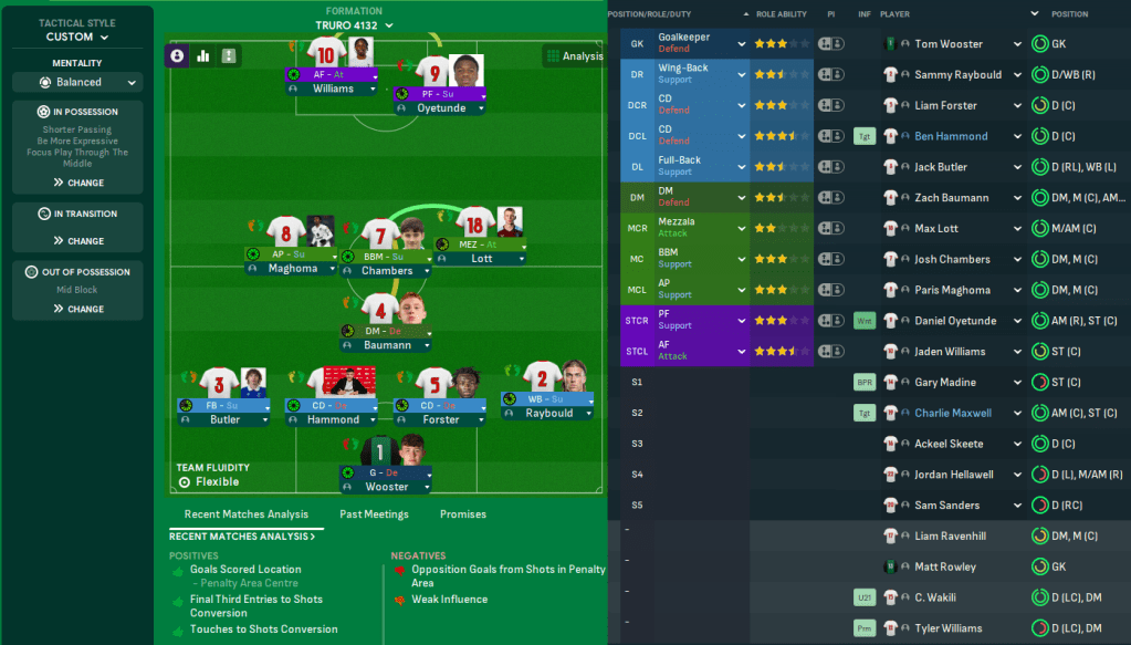 Truro began Trevelyan’s fourth season with a trip to Barnet, who they beat to win silverware in the final game of last season, and Forster and centre back Maxwell both scored on debut to earn a 2-2. Another draw followed with a 0-0 at home to Gillingham before losing 1-0 at Hartlepool, so scoring goals appeared to be a problem. But that changed at home to Oldham as Trevelyan switched to the 4-1-3-2. Maghoma laid on two goals in a 5-2 victory thanks to Maxwell’s late double off the bench and they won 5-2 again next time out at Wealdstone with Jaden scoring two early on.