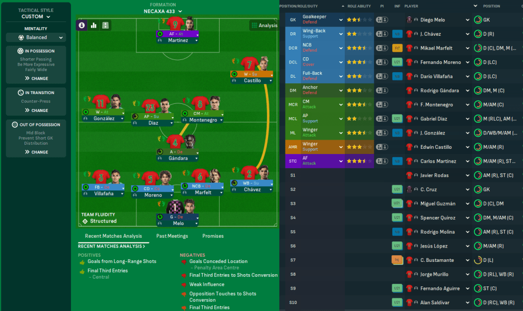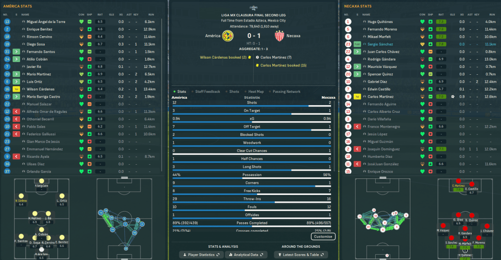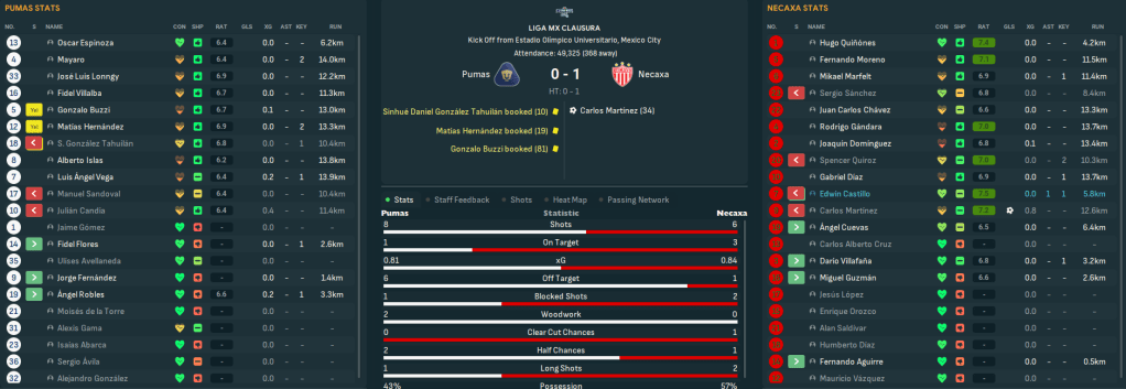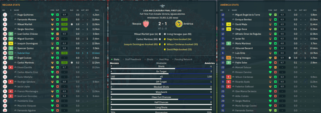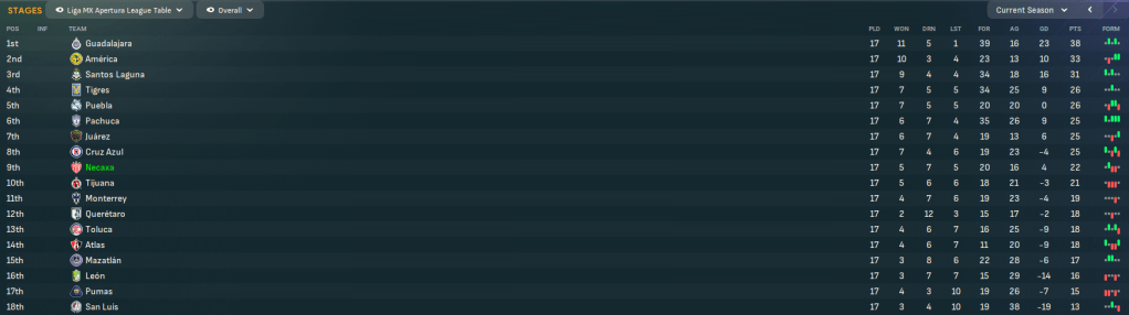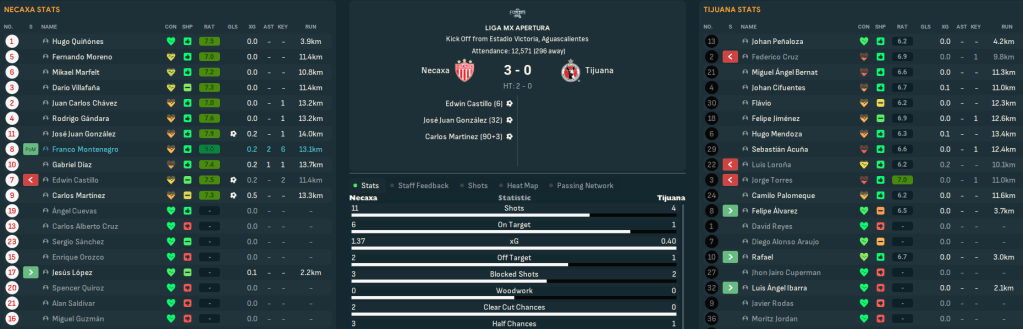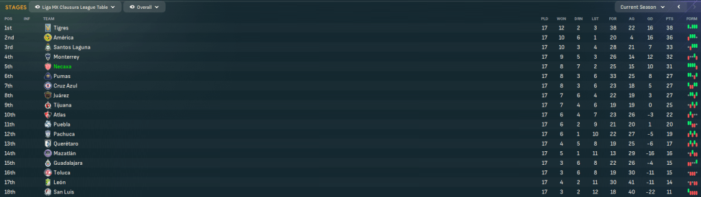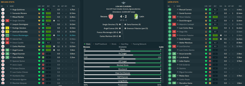 Necaxa began the second half of the 2046/47 campaign at home to Guadalajara. And a late goal by midfielder Franco Montenegro was enough for a 1-0 win, which the media described as “Mahtal’s tactical gamble paying off.” They lost 1-0 at Pachuca before their two biggest attacking threats, winger Edwin Castillo and striker Carlos Martínez, secured a 2-0 victory at home to León. That began an ongoing trend as Necaxa won their home games without conceding and lost their away games without scoring before getting thumped 4-1 at leaders Tigres and 4-2 at 3rd-place San Luis.