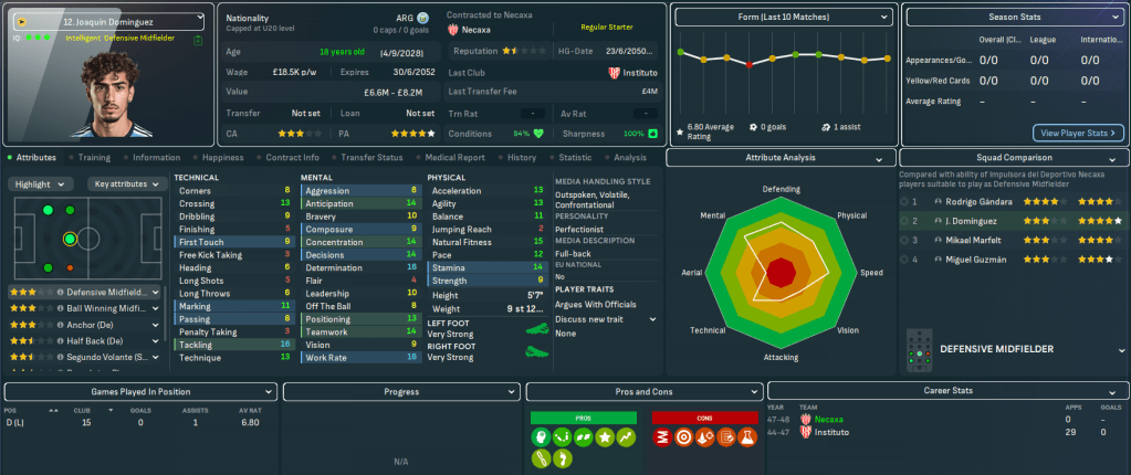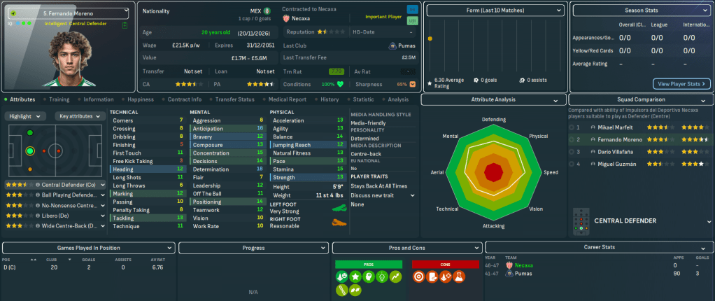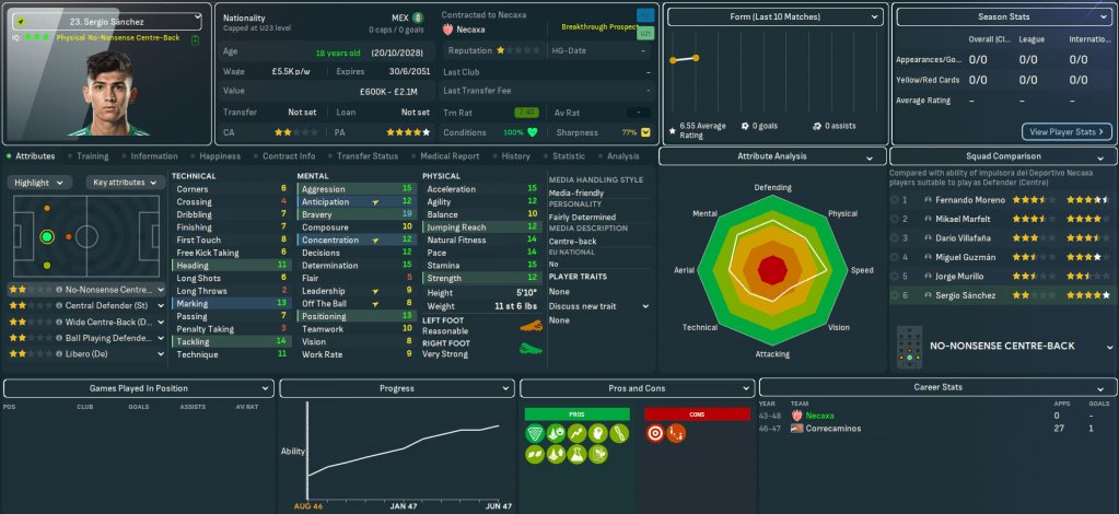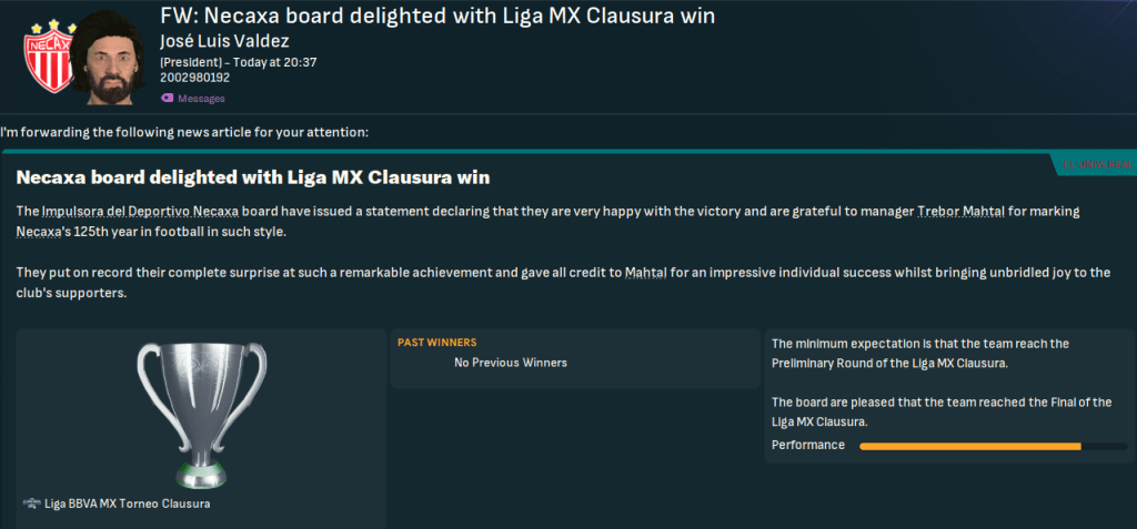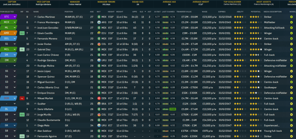 Given the recent struggles at Necaxa, Mahtal certainly hadn’t been expecting to win Liga MX Clausura in 2048. But improvement from young starlets like Díaz and Domínguez had pushed his side over the line in the latter stages. Martínez again led the way with 19 goals in 38 games, taking him to 153 Necaxa league goals in total, followed by Castillo (8) and Cuevas and Montenegro (5). While Castillo topped the assists with 10 followed by Díaz (9), Montenegro (8) and Domínguez (6). The wonderkid duo of Díaz and Domínguez were now wanted by Europe’s elite, and Mahtal was particularly fond of Díaz, who’d really stepped up a notch and won fans’ player and young player of the season.