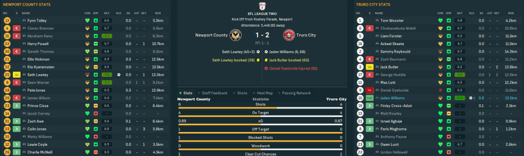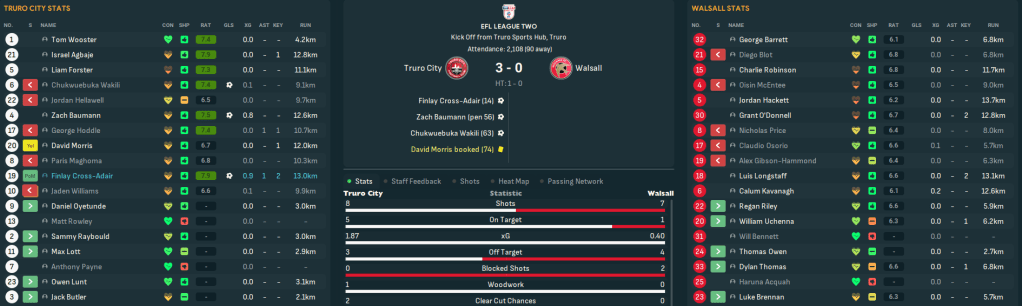 Trevelyan made a few tweaks to the tactic, which saw Truro finally get their first Football League win as Jaden scored twice to nick a 2-1 at Newport. However, those tactical changes didn’t work at all next time out as they got battered at home to Morecambe and somehow only lost 2-1. The manager saw enough in that game to ditch the 3-5-2 and go back to last season’s formation, which began with Morris scoring on his professional debut to earn a 2-2 at home to Northampton. But they were much improved at Bromley as Jaden and midfielder Zach Baumann’s penalty secured a 2-1 win, before a 0-0 at Grimsby and Daniel Oyetunde returned from injury to end his 13-hour goal drought with the winner at home to Bradford. And the move back to 4-2-3-1 really delivered as Cross-Adair, another Baumann penalty and Wakili led a 3-0 win at home to Walsall.