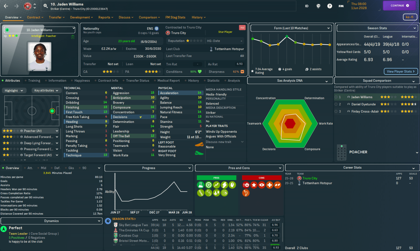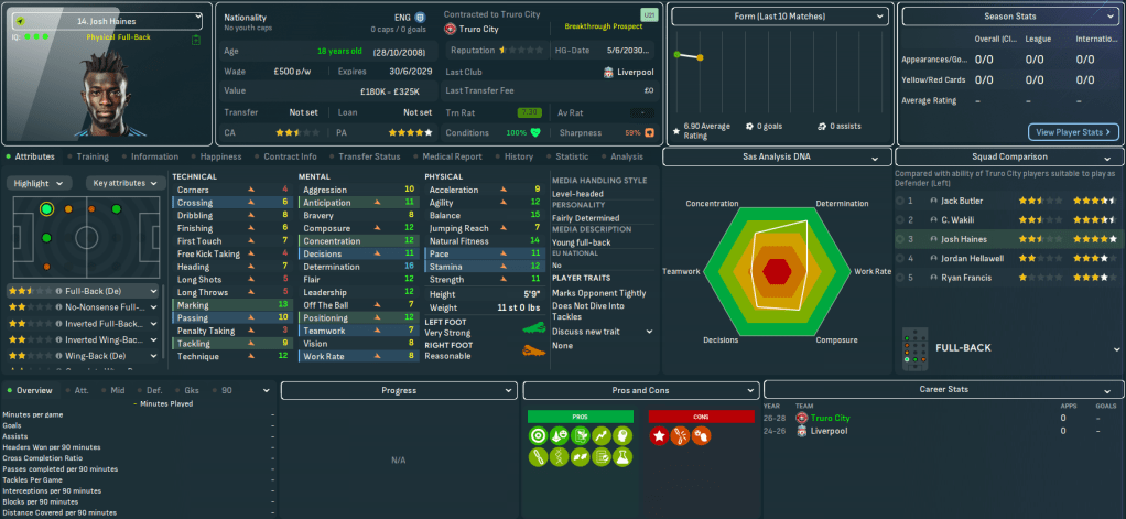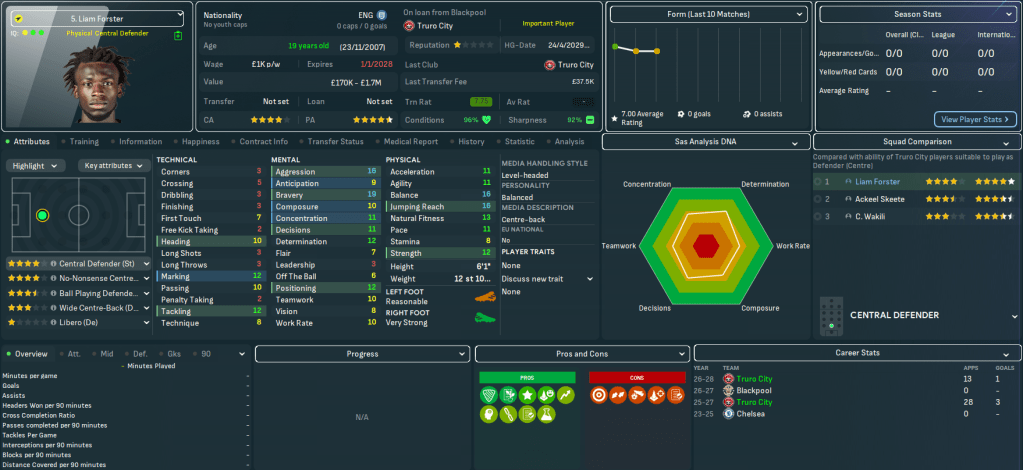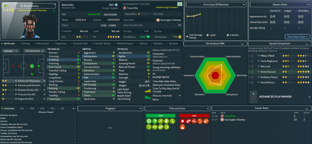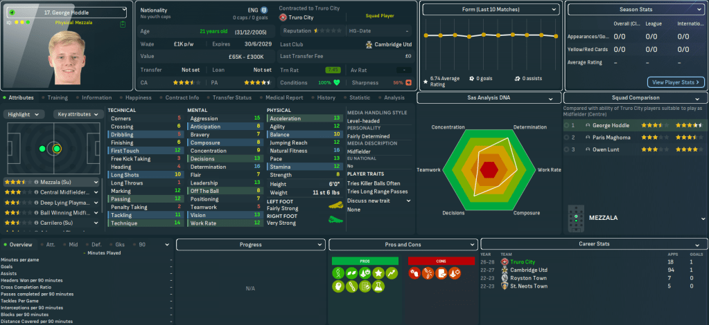 For the third year in a row, Truro had an experienced attacker retire as striker Gary Madine called it a day and departed the club along with 12 squad players. In their place, Trevelyan again proved his wheeler-dealer ability, bringing in a mass of free transfers led by midfielders George Hoddle, a second cousin of England legend Glenn, Crewe midfielder Owen Lunt, the nephew of former Champ Man legend Kenny Lunt, and striker Finlay Cross-Adair, and brought centre back Liam Forster back on loan from Blackpool until January. He also signed several exciting prospects in 17-year-old Arsenal centre back Israel Agbaje, Man City midfielder David Morris, Accrington striker Emini Roscoe, Liverpool left back Josh Haines and Man United midfielder Anthony Payne. Trevelyan initially decided to switch to a more conservative 3-5-2 approach, keeping last season’s successful 4-1-3-2 in his back pocket.