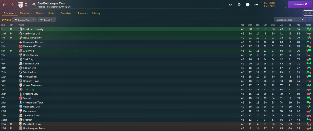 The uptick in form continued, including Jaden scoring the only goal at home to Cambridge then earning an impressive point at leaders Notts County. And, while they weren’t losing too many, they headed into 2028 only one draw behind the all-time League Two record of 15! But relegation looked a long-gone possibility as Truro sat in 11th place, 16 points clear of the dropzone and 6 points off the playoffs.