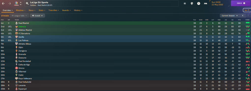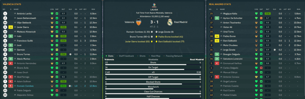 The cup struggles allowed Valencia to focus fully on LaLiga. They began the 2050s with a big game at home to 4th-place Sevilla, and a Torres header after an hour secured a 1-0 win. Winger Adam Sullivan scored twice in a 6-1 hammering of Las Palmas before a 3-1 win at rivals Villarreal, part of an eight-game winning streak that lifted Valencia just 2 points behind leaders Real. Their title credentials were tested by entertaining Barca, and they got a great start as Guilló won a penalty that wide playmaker Romain Combes converted. Two tired teams didn’t really get going and, despite a late Barca push, Valencia held on for a huge 1-0 victory that took them 19 points clear of their rivals.