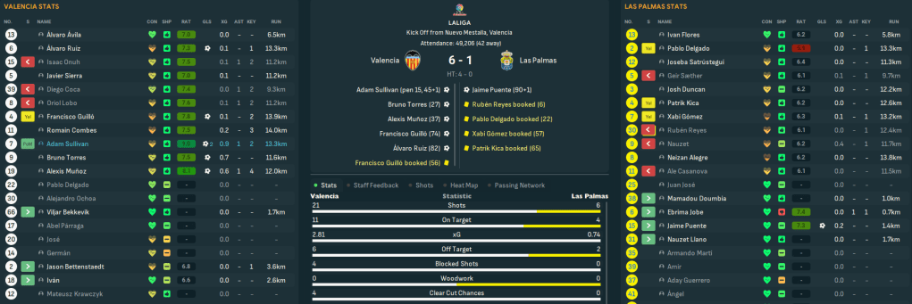 Game 1 – Real Sociedad (9th, home): Valencia maintained the pressure as Hernández got his first goal after seven months out injured to lead a comfortable 4-2 win. The next day, Real suffered a surprise 3-0 defeat at Osasuna and Atlético won 1-0 at home to Bilbao, then in midweek, Atlético drew at Cádiz and Real won 1-0 at Sociedad. That took Valencia 6 points clear of Real and 7 clear of Atlético having played one more.