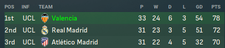 Game 4 – Sevilla (6th, away): Another tough road game took Valencia to Sevilla on the Friday night, and they struggled to a 1-0 defeat. The next day, Real gave Mahtal a disappointing 66th birthday present by beating Girona 2-1 to move three points clear going into the final weekend.