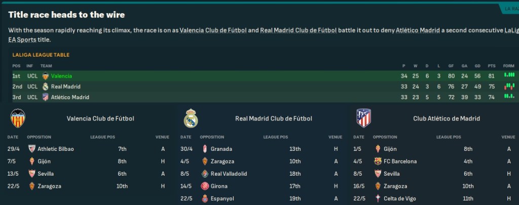 Game 2 – Athletic Bilbao (7th, away): The first of two tricky away days took Valencia to Bilbao, who blew the title race wide open with a 3-1 win. Real beat Granada 4-0 and Atlético drew 2-2 at Gijón, then the final games in hand saw Real win 2-1 at Zaragoza and Atlético draw 0-0 at Barca, leaving the top two tied on points with three game remaining with Valencia leading by 1 goal – as both teams won 3-1 at home against the other.