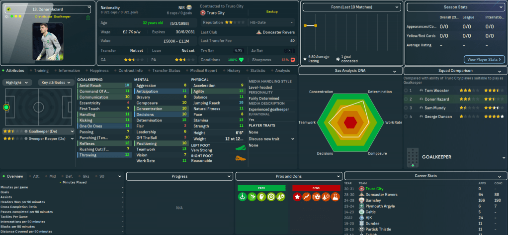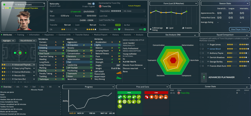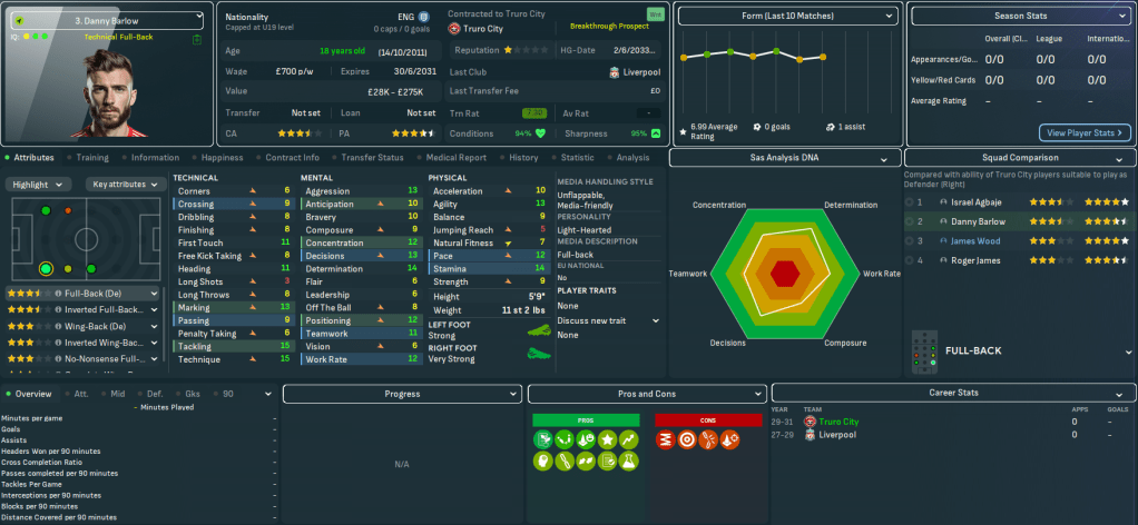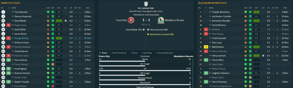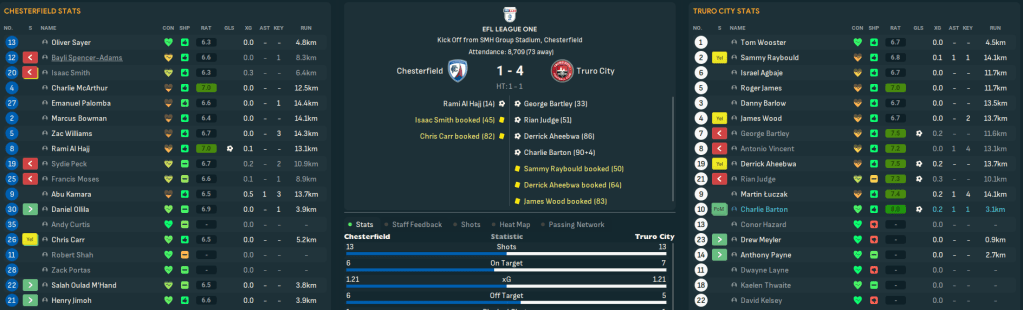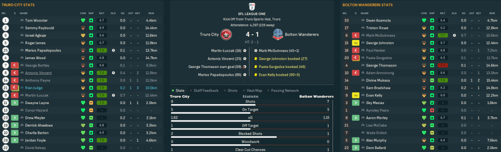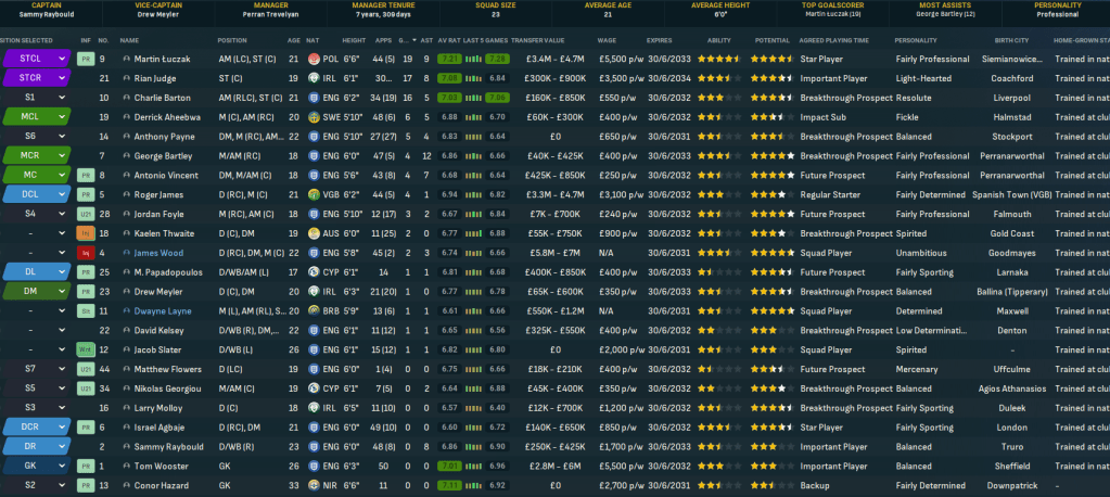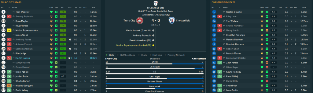 For the first time in this save, Truro began the season with a home game. They welcomed QPR down to Cornwall and a solid defensive effort and Judge’s late debut goal off the bench earned a deserved 1-0 victory as he latched onto Vincent’s pass for a debut assist. There was more of the same at Bolton as Tom Wooster made seven saves before Bartley beat two men to curl in his first senior goal on 84 minutes. Truro hit the top of League One for the first time as Vincent’s 35-yard wondergoal led a 3-1 win at home to Blackpool and stayed there as Bartley, Judge, Aheebwa and Barton secured a 4-1 thrashing of Chesterfield.