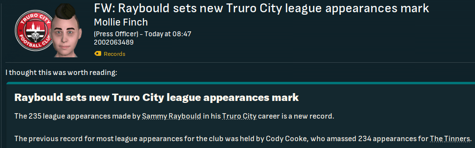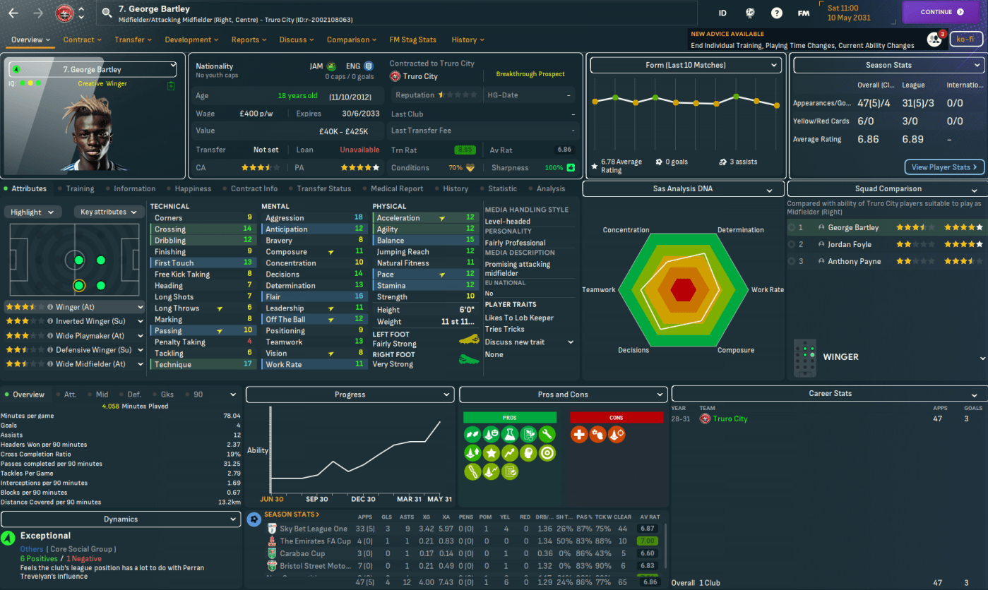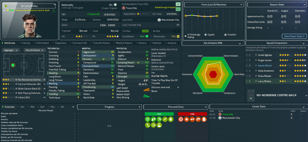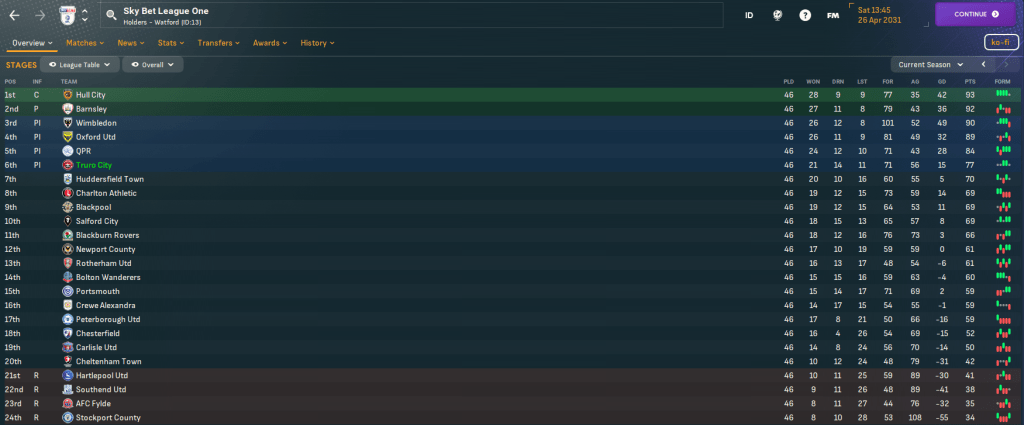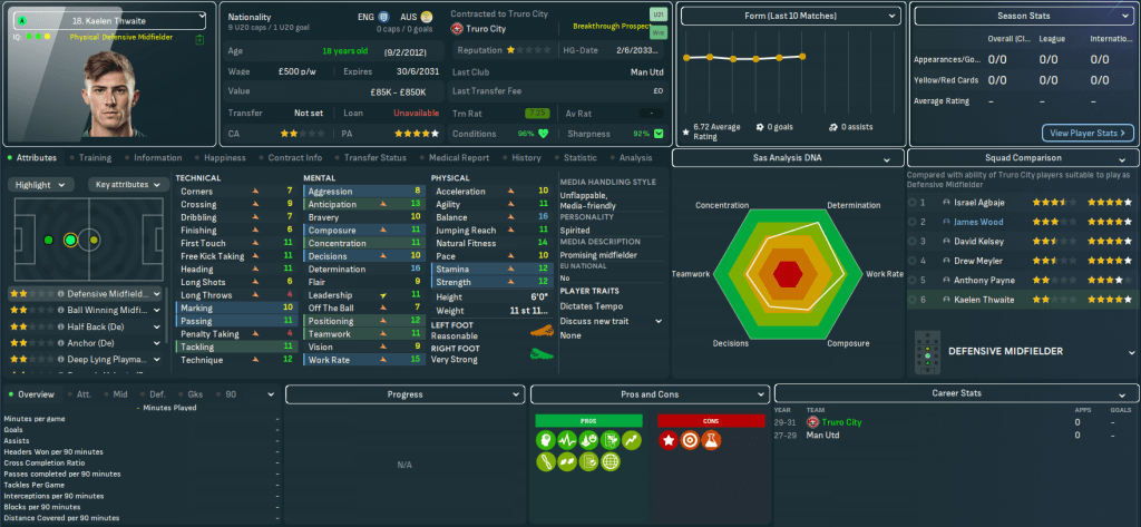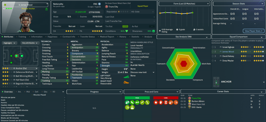 For the first time in this save, Truro began the season with a home game. They welcomed QPR down to Cornwall and a solid defensive effort and Judge’s late debut goal off the bench earned a deserved 1-0 victory as he latched onto Vincent’s pass for a debut assist. There was more of the same at Bolton as Tom Wooster made seven saves before Bartley beat two men to curl in his first senior goal on 84 minutes. Truro hit the top of League One for the first time as Vincent’s 35-yard wondergoal led a 3-1 win at home to Blackpool and stayed there as Bartley, Judge, Aheebwa and Barton secured a 4-1 thrashing of Chesterfield.