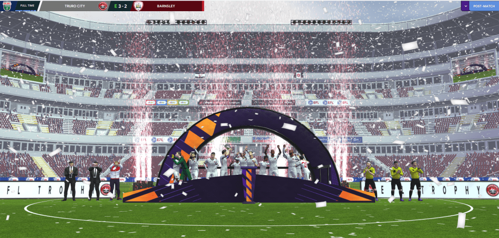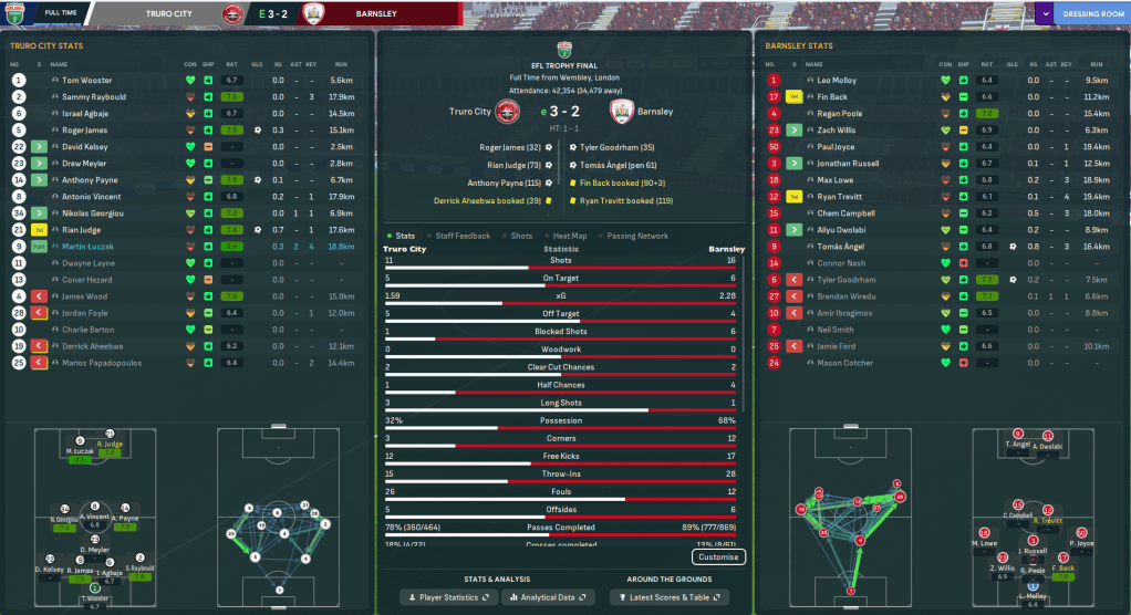 Truro had only previously won one of their nine EFL Trophy games – against Brighton U21s – and that trend continued with 0-0 draws but penalty shootout successes against Southend and Cheltenham. But they finally won one as Barton and Judge goals downed Bournemouth U21s 2-1 to reach the knockouts for the first time. They edged past Swindon 1-0 then beat Wimbledon and Rochdale on penalties after 0-0 draws to reach the semis, where they, yet again, drew 0-0 and beat Oxford on penalties. That teed up another Truro’s second trip to Wembley to face League One leaders Barnsley in the Final. Trevelyan was without the injured Bartley, so lined up: