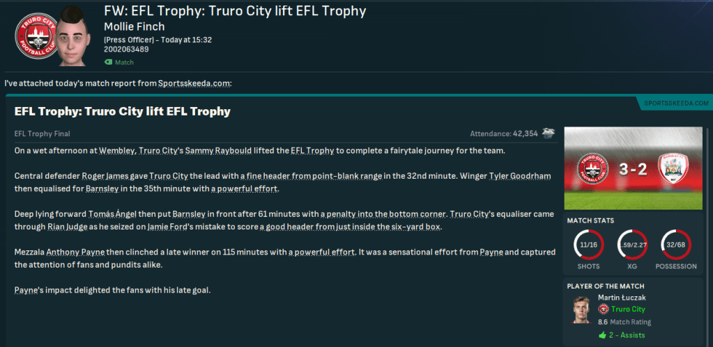The game started slowly, but Truro landed the first blow as James headed in a nearpost corner only for Barnsley to swiftly equalise. Barnsely then went ahead through a disgrace of a penalty decision but a wonderful Foyle pass sent Luczak through to cross for Judge to equalise. Barnsley thought they’d nicked it in injury time but their striker was ruled offside and it went to extra time. Nothing happened in the extra period until, five minutes from time, midfielder Nikolas Georgiou collected a Barnsley corner, raced through the middle and put Anthony Payne in to smash Truro in front. And that was enough for Truro to upset the odds and win another trophy.