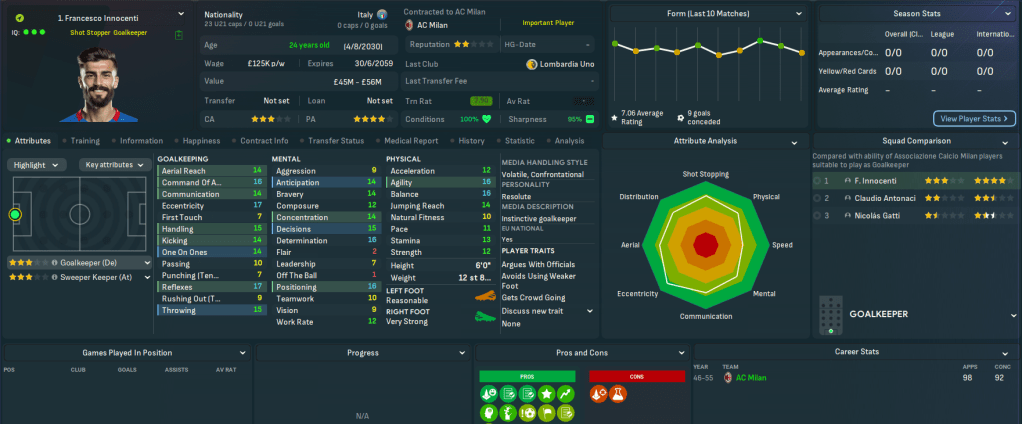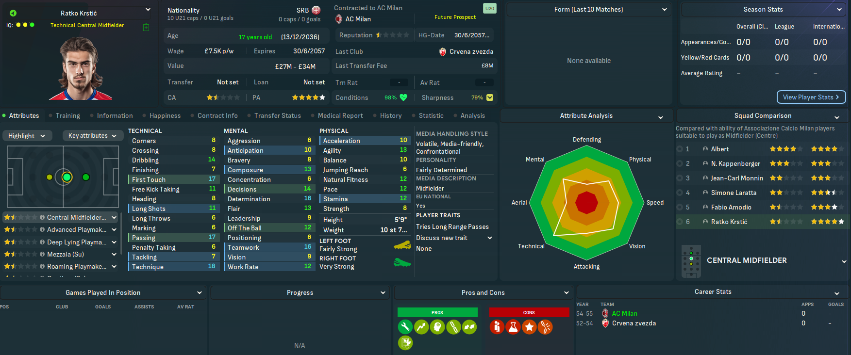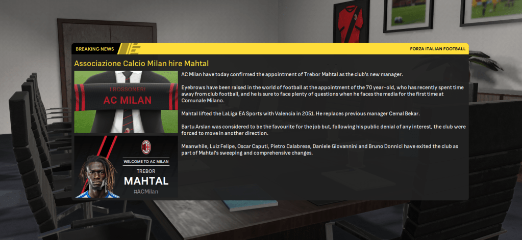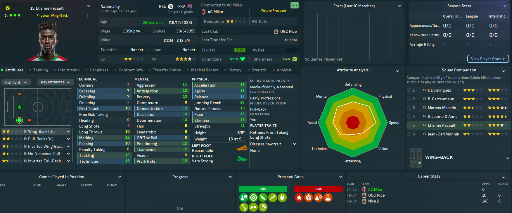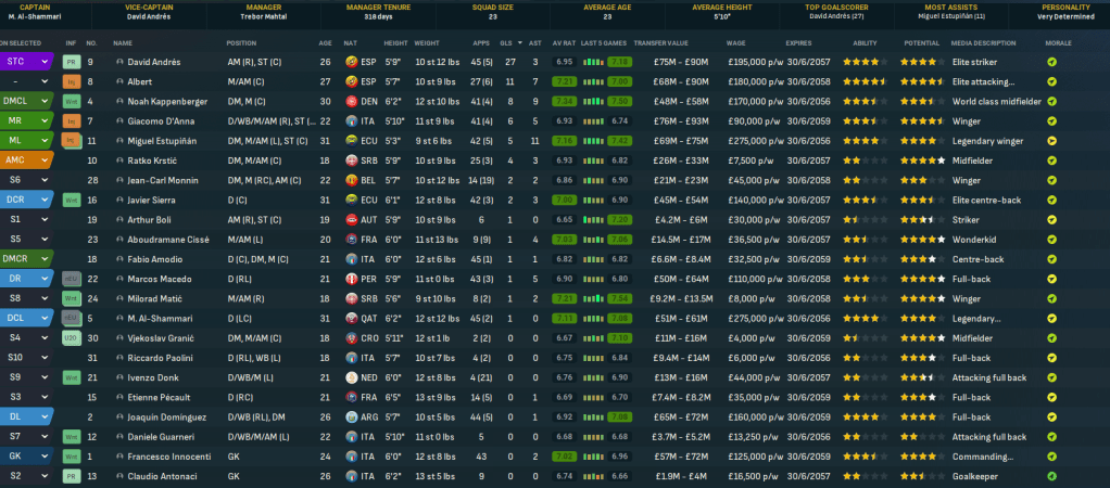 AC Milan still play at the 75,710-capacity San Siro, which was built in 1926 and has perfect 20 infrastructure. Mahtal walks into a club with £61m in the bank, a £50m transfer budget and has £600k of its £4.1m weekly wage budget going spare. Last season, Milan finished a lowly 7th in Serie A, a huge 41 points behind winners Napoli. That was largely due to the usual dross Mahtal discovered when he joined a new club, so he carried out his usual firesale to bring in £177m for 19 players. And, in truth, he probably sold too many players and left the squad a little short.