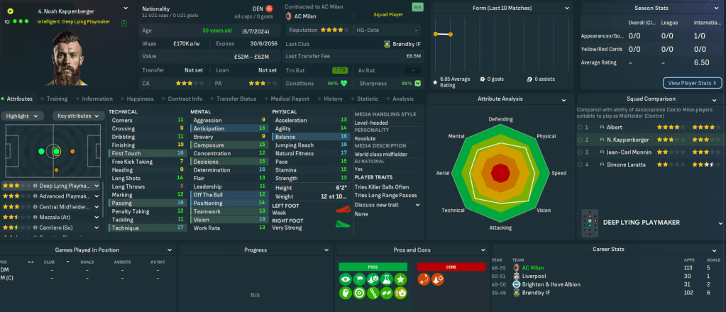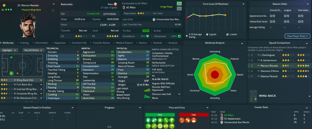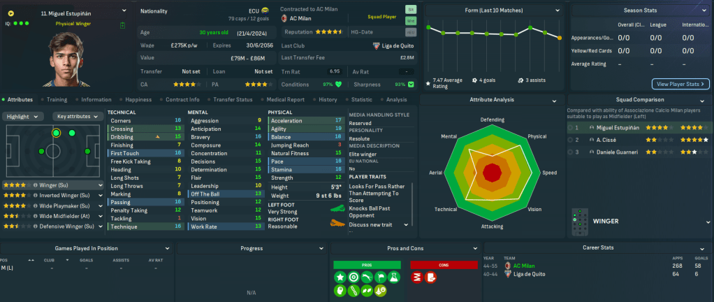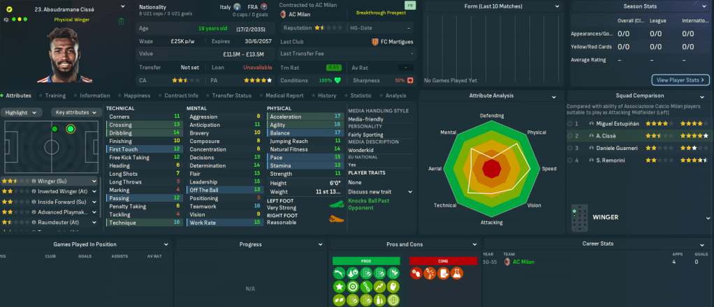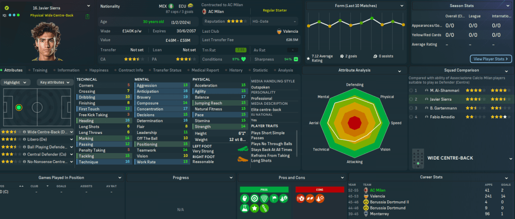 There was a familiar face at Milan as Mahtal was reunited with his former Dortmund and Valencia defender Javier Sierra, who’s now 30. The best player remaining at Milan was elite striker David Andrés along with Spanish midfielder Albert, Ecuadorian winger Miguel Estupinán, legendary Qatari centre back Mohammed Al-Shammani, goalkeeper Francesco Innocenti and midfielder Noah Kappenberger. They also had a few exciting talents in winger Aboudramana Cissé, Peruvian full back Marcos Macedo and winger Salvatore Remorini.