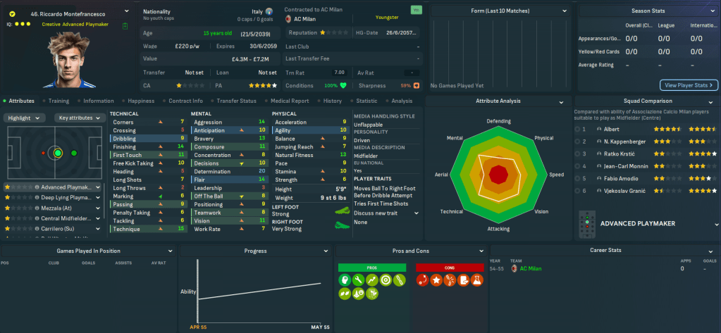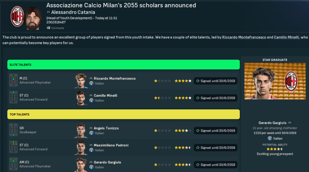 The good news was that Milan’s potential was boosted by a strong youth intake led by 5-star midfielder Riccardo Montefrancesco and striker Camillo Minelli.