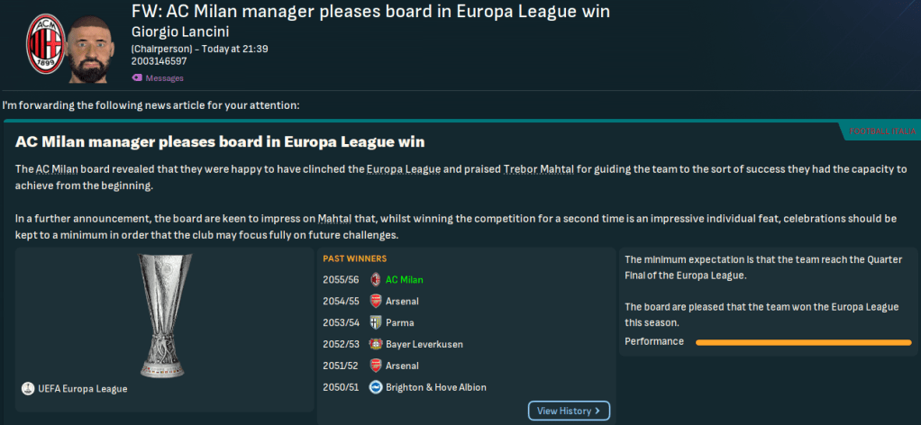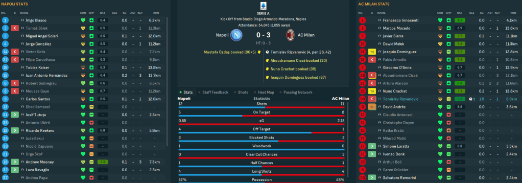 Milan began 2056 where they left off 2055, by putting six past Lecce. And a solid start to the year teed up a big clash between the top two in early February, but Milan slipped to a disappointing 4-2 defeat at home to Napoli. That sent Napoli one point clear at the top and inevitably sparked them onto a relentless winning run. Milan tried their best to keep pace, including Andrés bagging four in a 5-1 thrashing of Spezia. But draws at Palermo and Fiorentina and a rival defeat at Inter allowed Napoli to stretch their lead to 8 points.