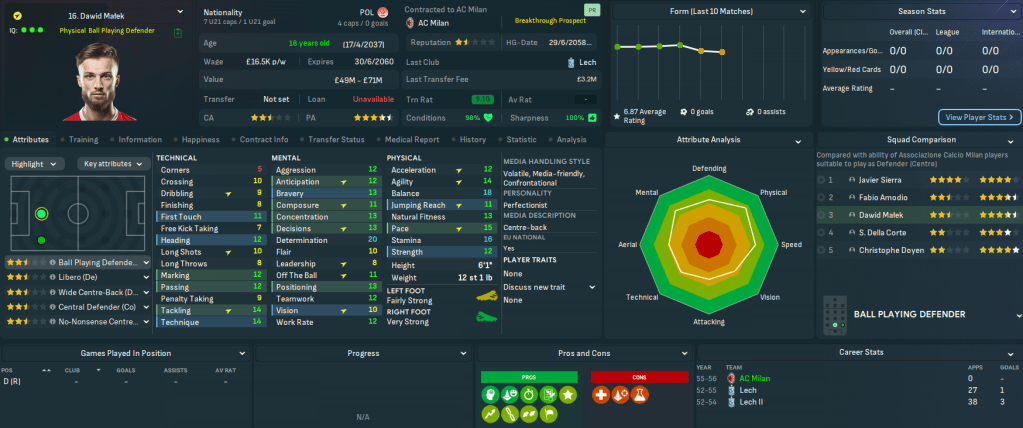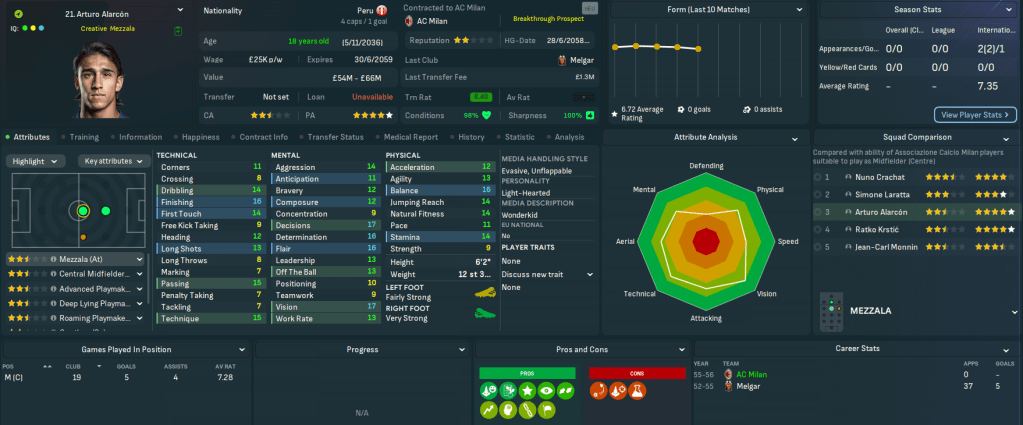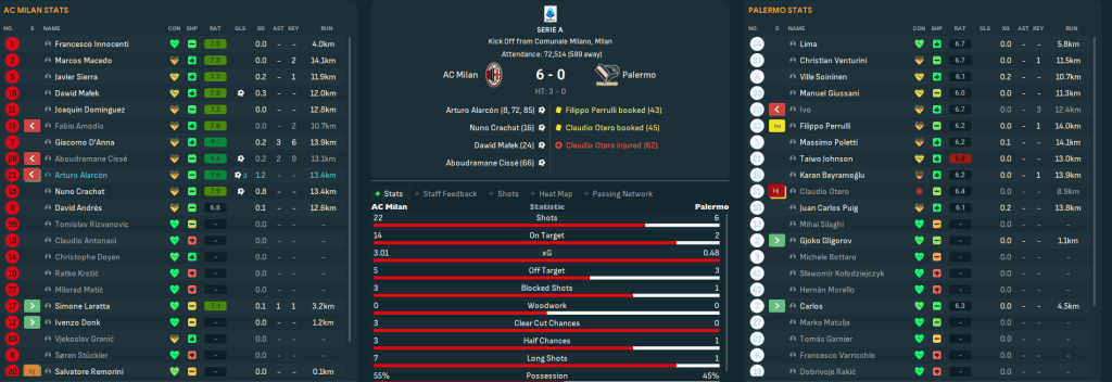 Milan finished 2nd with 92 points after 29 wins, 5 draws and 4 defeats, scoring a record-breaking 119 goals (3.13 per game) and conceding 36. Andrés scored a ludicrous 45 goals in 37 games and topped the average rating table with 7.69, ahead of D’Anna on 7.64. D’Anna was also the leading assisted with 22, which was 8 more than anyone else, and Innocenti kept a league-high 20 clean sheets.
