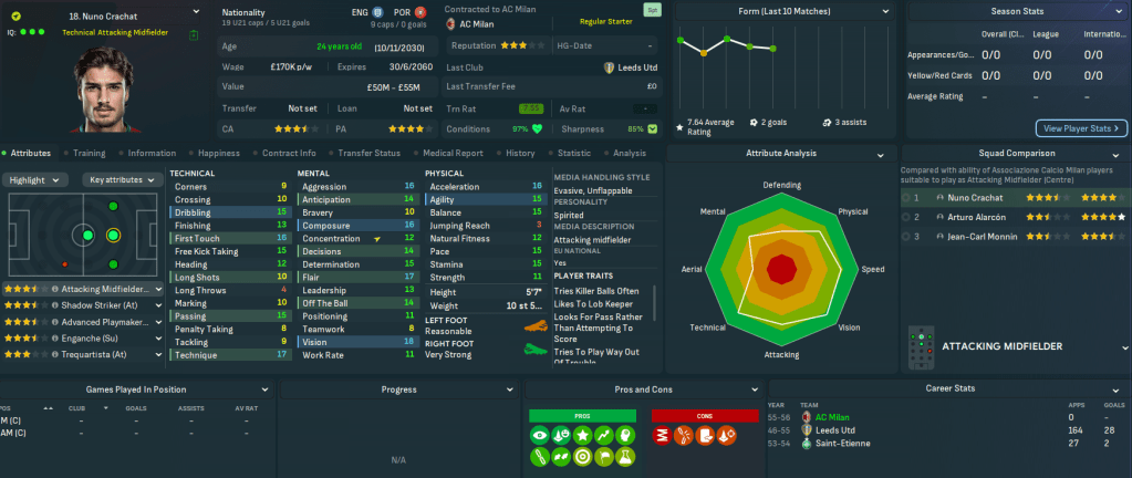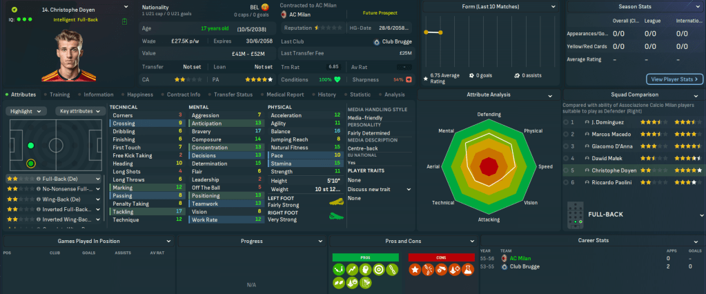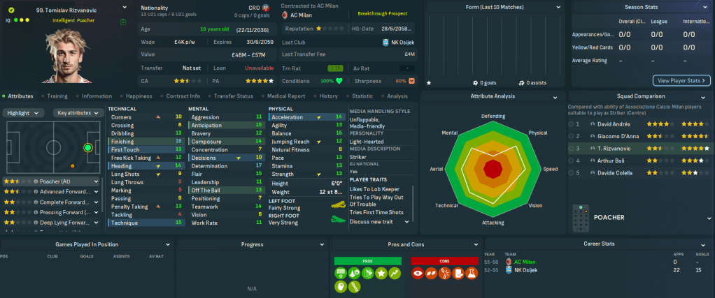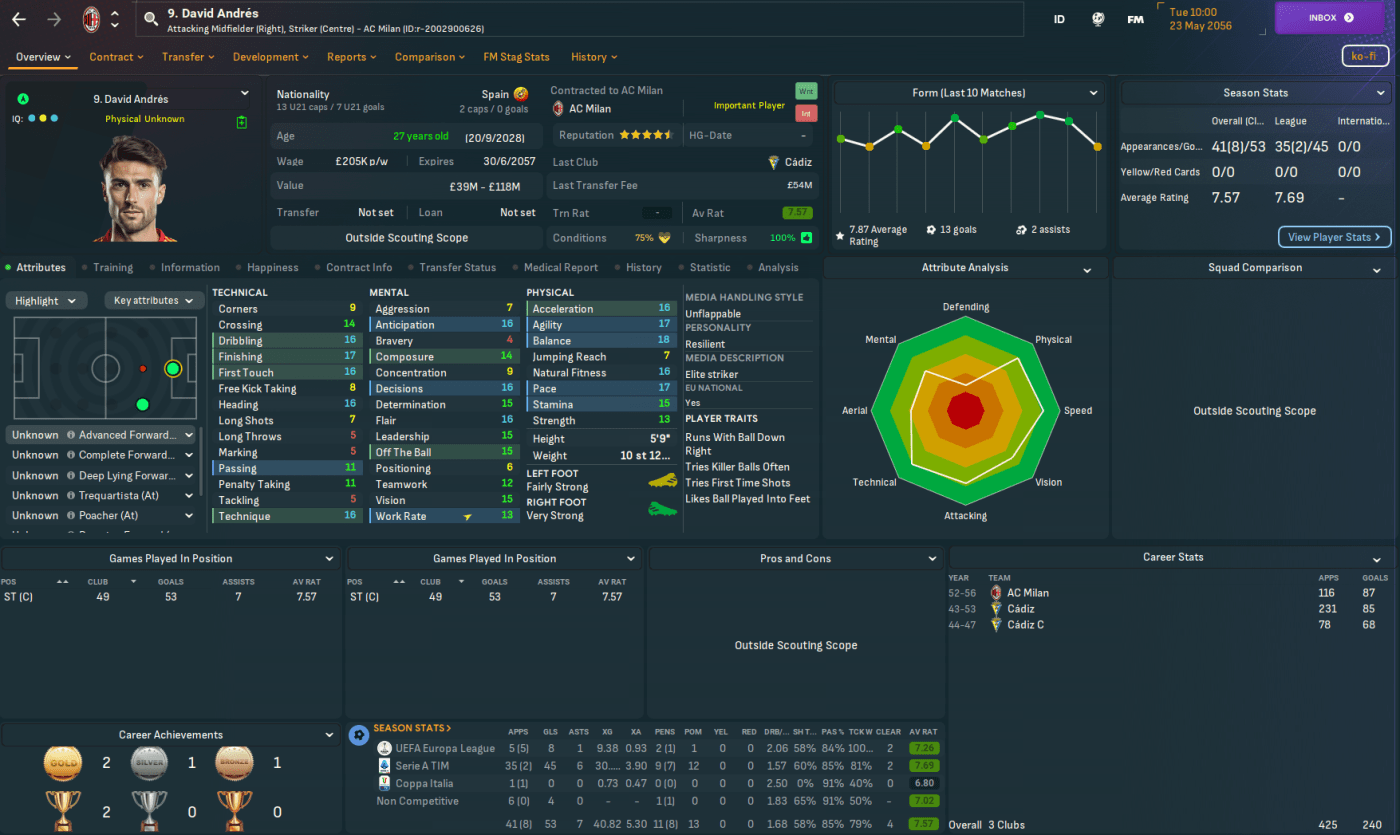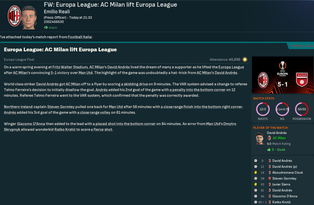 Milan enjoyed a stellar season that, despite not quite winning the Scudetto, ended with glory in the Europa League. They scored a mass of goals along the way, setting new Serie A records and their top six scorers sharing a total of 126 goals. Andrés was their main man with a new club record 53 goals in 49 games, smashing the previous record of 38 set way back in 1951 by Gunnar Nordahl. Crachat also impressed with 24 goals and 14 assists, as did wingers D’Anna with 28 assists and 14 goals and Cissé with 15 goals and 11 assists and Alarcón with 12 goals and 13 assists.