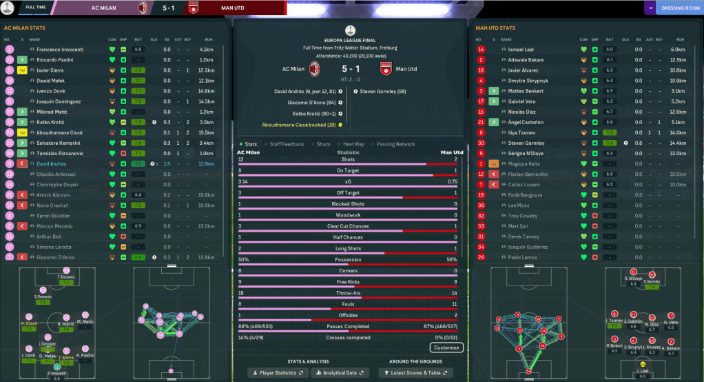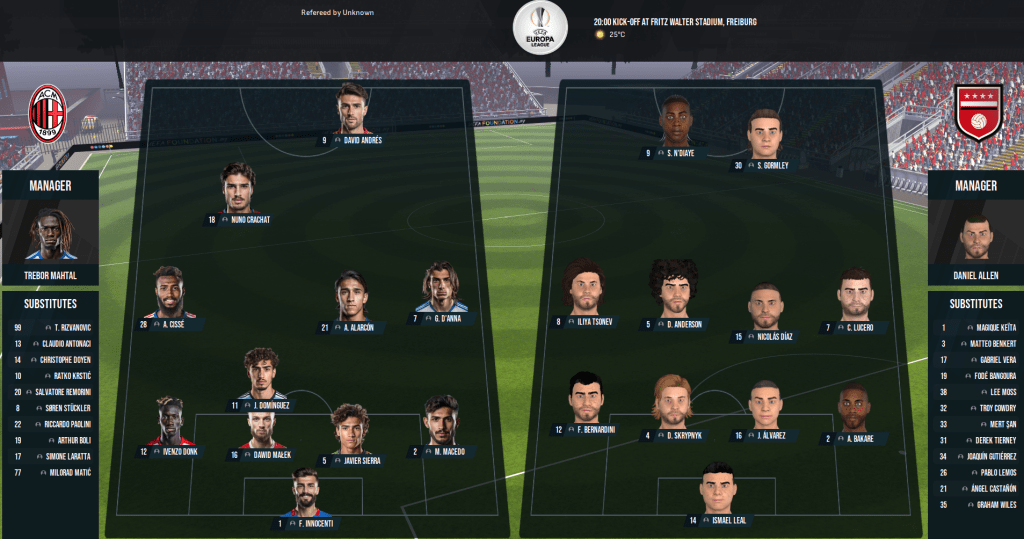 Milan may have eased through to the Europa League Final, but a much tougher test followed as they faced Mahtal’s former club Man United at Fritz Walter Stadium in Freiburg. Surprisingly, Milan were looking to win the competition for the first time in their 157-year history, while United were seeking a fourth. Mahtal just about had a clean bill of health, despite a tired first 11, so lined up: