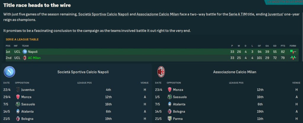 However, Napoli finally lost at Roma then drew at home to Inter, while Milan dominated 3rd-place Torino 4-1, led by Andrés’ 40th goal of the season, to give themselves some hope. Indeed, the top two went into the final five games with Napoli 3 points clear and having scored a combined 195 goals. And Milan arguably had the easier run-in.