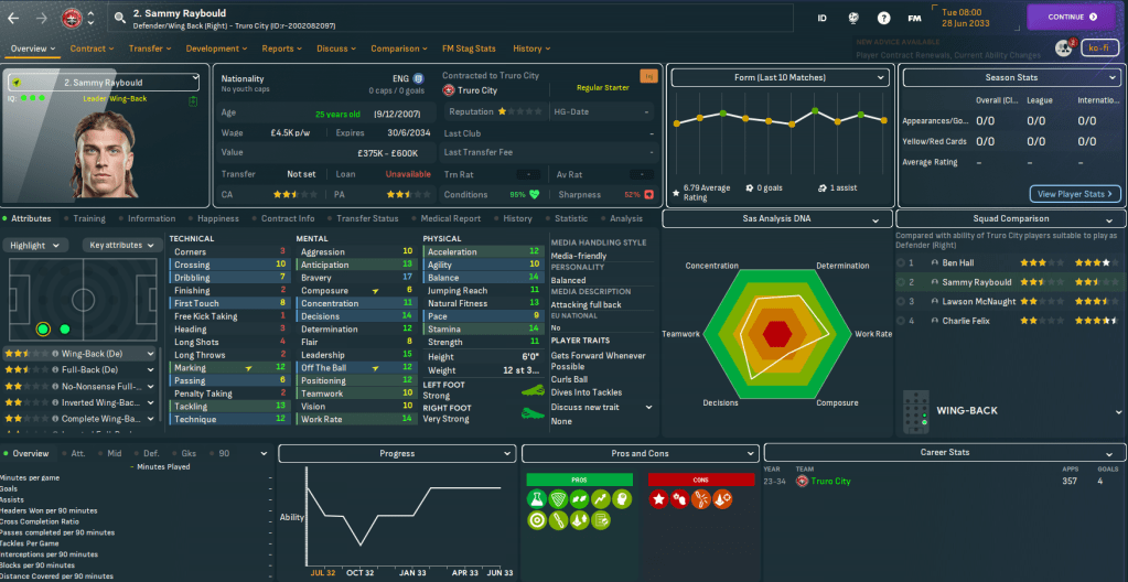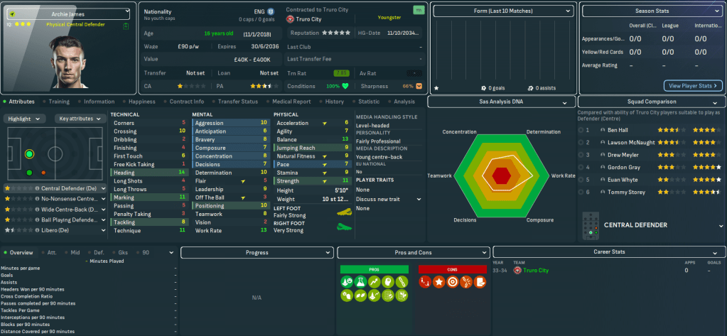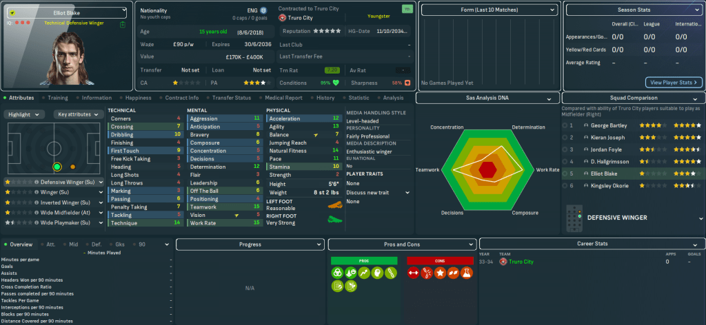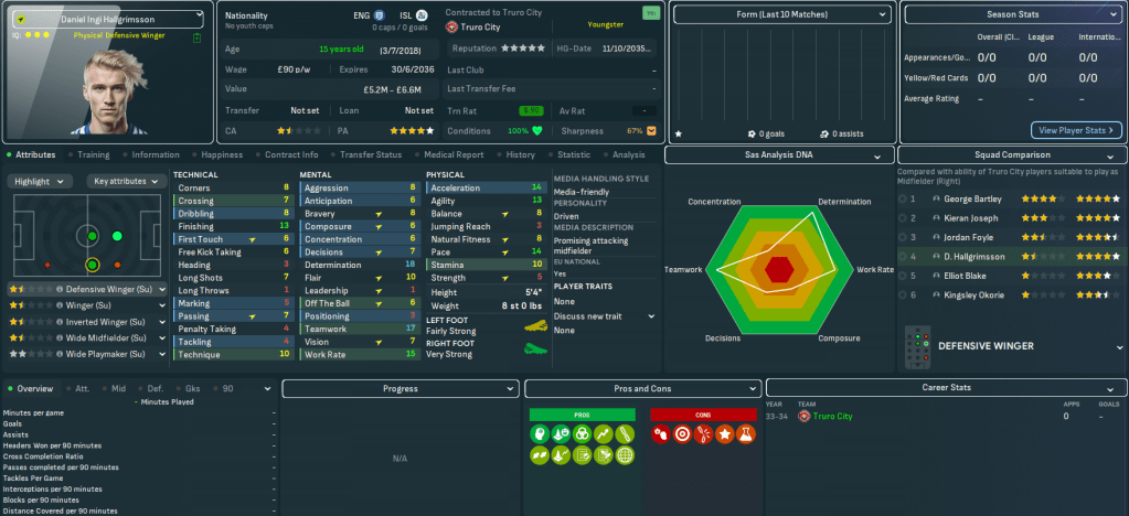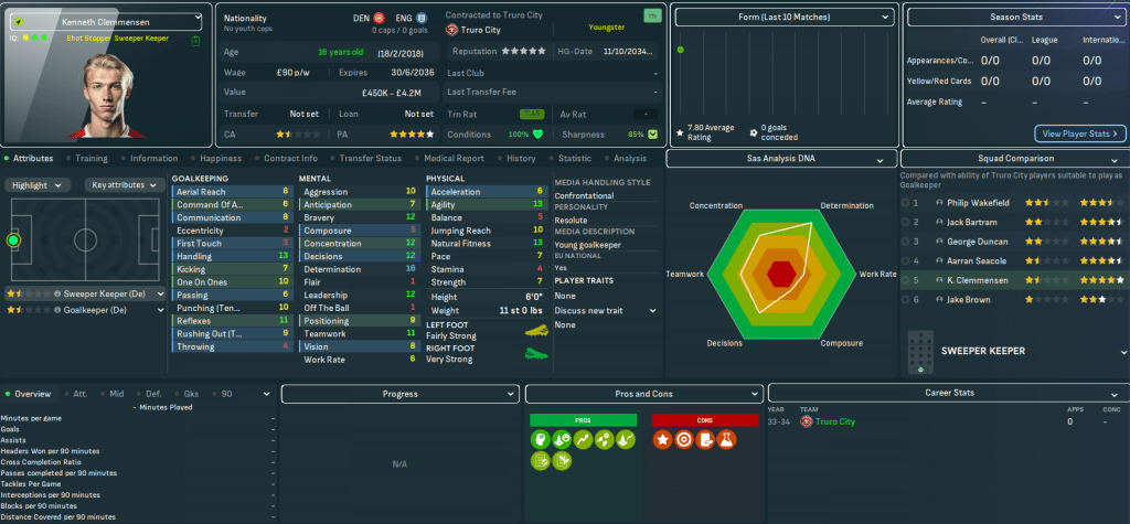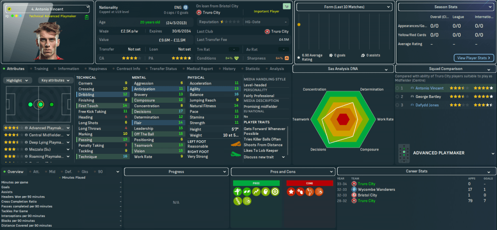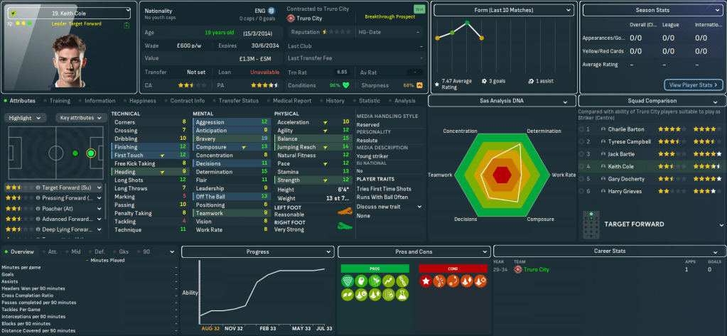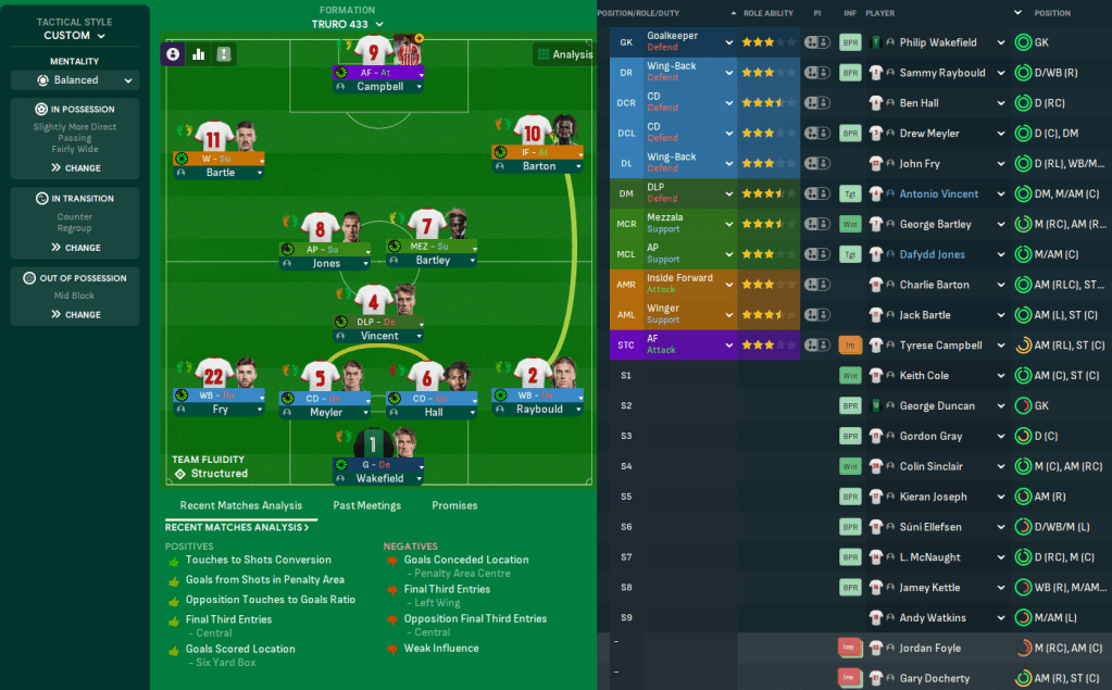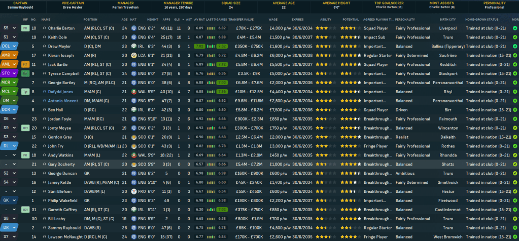 Trevelyan came into his 11th season at Truro with £12m in the bank, a £10.5m transfer budget and a £155k weekly wage budget, of which they were spending £70k. That was boosted by selling backup midfielder Dylan McDonnell and right back Charles Felix to Fulham and Middlesbrough for £4m and £1.2m, before loaning out a mass of youngsters. Trevelyan chose to continue developing his best youngsters, but brought homegrown Antonio Vincent back to the club on loan from Bristol City along with fellow midfielder Dafydd Jones from Everton, while Newcastle winger Andy Watkins and Middlesbrough full back John Fry arrived on free transfers. He also promoted 6ft 4in striker Keith Cole, winger Gary Docherty, midfielder Colin Sinclair, centre back Gordon Gray and left back Súni Ellefsen.