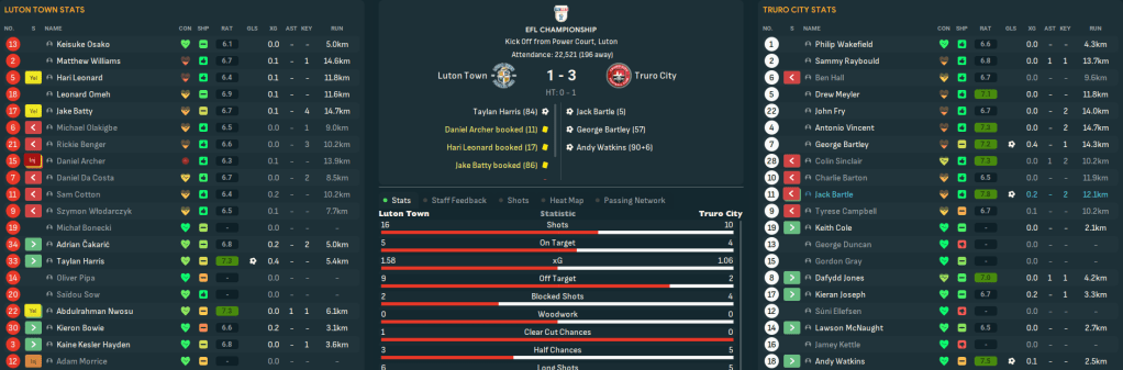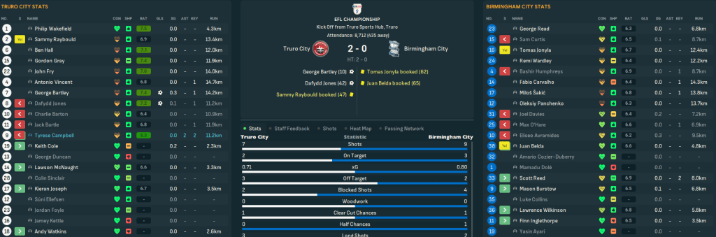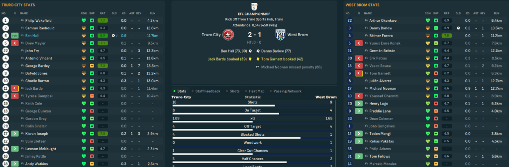 For the 10th time in 11 seasons, Truro began the season away from home with a trip to Derby. Injuries forced Cole, Sinclair and Fry into debuts as they slipped to an unlucky 1-0 defeat. That began a tough start to the campaign as Cole earned a hard-fought draw at home to Coventry, on an odd weekend that saw all but two Championship games drawn, before doing well to only lose 1-0 at Ipswich. They backed that up with two superb performances, dominating league favourites West Brom by 16 shots to 9 and nicking a 2-1 win through two headers from corners by centre back Ben Hall and then winning 3-1 at Luton with goals by winger Jack Bartle, homegrown midfielder George Bartley and Watkins’ first for the club. They were then a little unlucky to lose 2-1 at home to Everton, but did well to come through a challenging start firmly in mid-table.