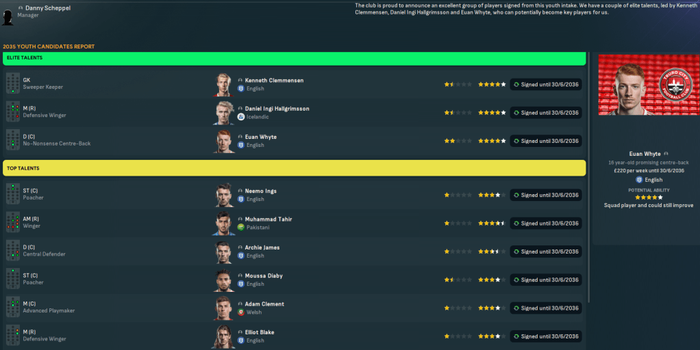 Truro’s youth development continued to deliver with three 5-star prospects in the latest intake. The pick of them was Falmouth-born centre back Euan Whyte along with intriguing Icelandic winger Daníel Ingi Hallgrímsson and half Danish goalkeeper Kenneth Clemmensen. A few more prospects included Pakistani winger/full back Muhammad Tahir, Ivorian striker Moussa Diaby, midfielder Adam Clement and winger Elliott Blake, along with centre back Archie James and brilliantly named striker Neemo Ings.