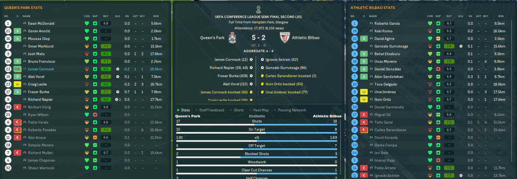 Back on home ground, Queen’s Park bossed the early stages and Cormack again stepped up to get in behind and neatly convert into the far corner after 12 minutes. They moved ahead in the tie as Leslie threaded a ball through for Napier to calmly finish and were in dreamland as Mata floated in a cross for Napier to power in a header. However, Bilbao scored with their first attack after an hour to make it nervy and inevitably equalised from a corner with 4 minutes remaining. A quiet extratime followed, until Burke picked the ball up from a corner and played a delicious one-two with Cormack before slotting in at the far post. Four minutes later, he led a counter to tee up Vorel to settle the semi. And send Queen’s Park into a European Final!!