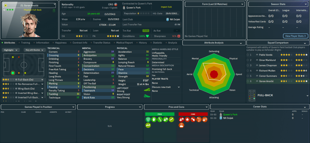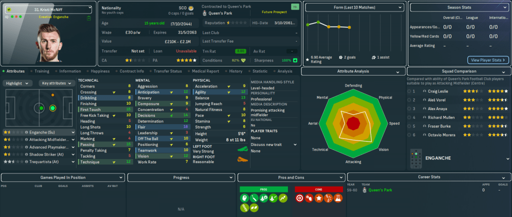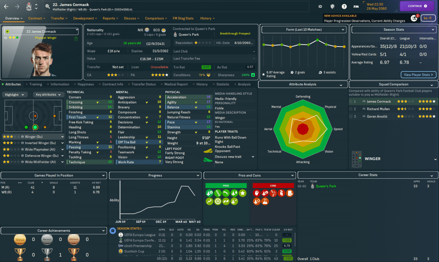 Mahtal’s reward for youth development was McDonald and Leslie being called up to the Scotland squad, and Leslie became the club’s first academy product to earn a senior cap. While 16-year-old Cormack made it to number 12 on NxGn 2060 and the Under 18s side won their league by 6 points. So there was plenty of promise at Queen’s Park. And the potential was boosted by another decent youth intake led by midfielders Kyle Smith and Kristi McNiff.