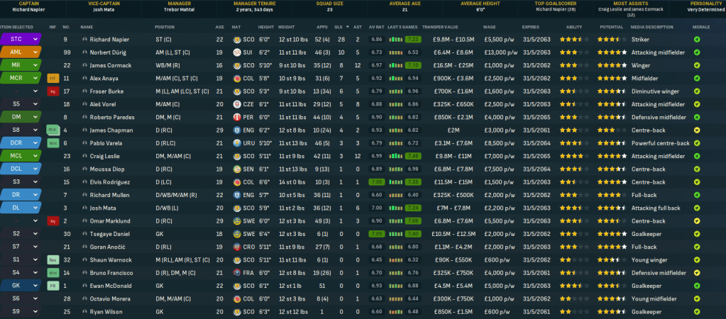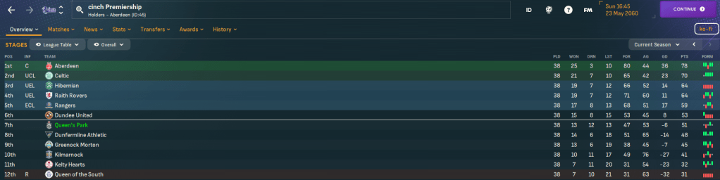 Moving into the 2060s, Queen’s Park’s tricky season continued with a narrow 3-2 defeat at runaway leaders Aberdeen and a 4-1 thumping at Rangers. They continued to struggle, but a heavily rotated side ahead of the Levski first leg somehow managed to beat Celtic 2-0. And they finished the season in 7th to go into the relegation group, and that’s where they finished while Mahtal rotated the team to prioritise Europe. They finished on 51 points after 13 wins, 12 draws and 13 defeats, scoring 47 and conceding 53. Napier was the league’s 2nd-top scorer with 17 in 35, 4 behind Aberdeen’s Enric, who’d ludicrously been loaned from Barcelona, and McDonald kept a league-high 11 clean sheets.