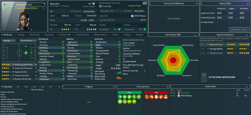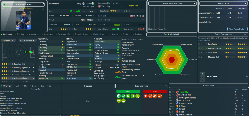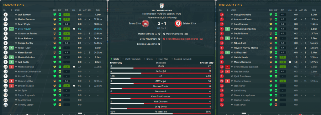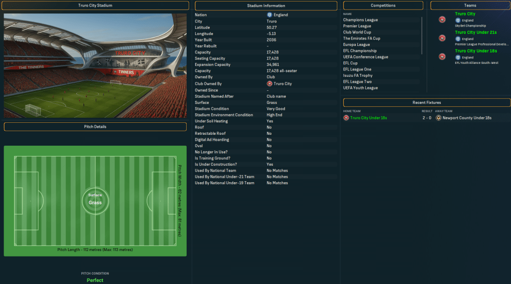 Truro City Stadium was officially unveiled on 3 September 2036. The first game in the new home saw Truro entertain Bristol City, who’d been in the Premier League for the previous four seasons, and started well as Satríano tapped in a loose ball after just 30 seconds and Meyler headed home a corner after 14 minutes. Bristol completely dominated and got one back, only for López to drill his first Truro goal from 25 yards to make it 3-1 from 4 shots to 16. And another solid Bartram performance ensured it stayed that way for a highly undeserved victory in front of a record 16,109 crowd that earned a new gate receipts record of £300k. Two more home games followed in a week and they drew 0-0 with Sheff U before Turay’s first senior goal opened the scoring in a 2-1 win over Blackburn.