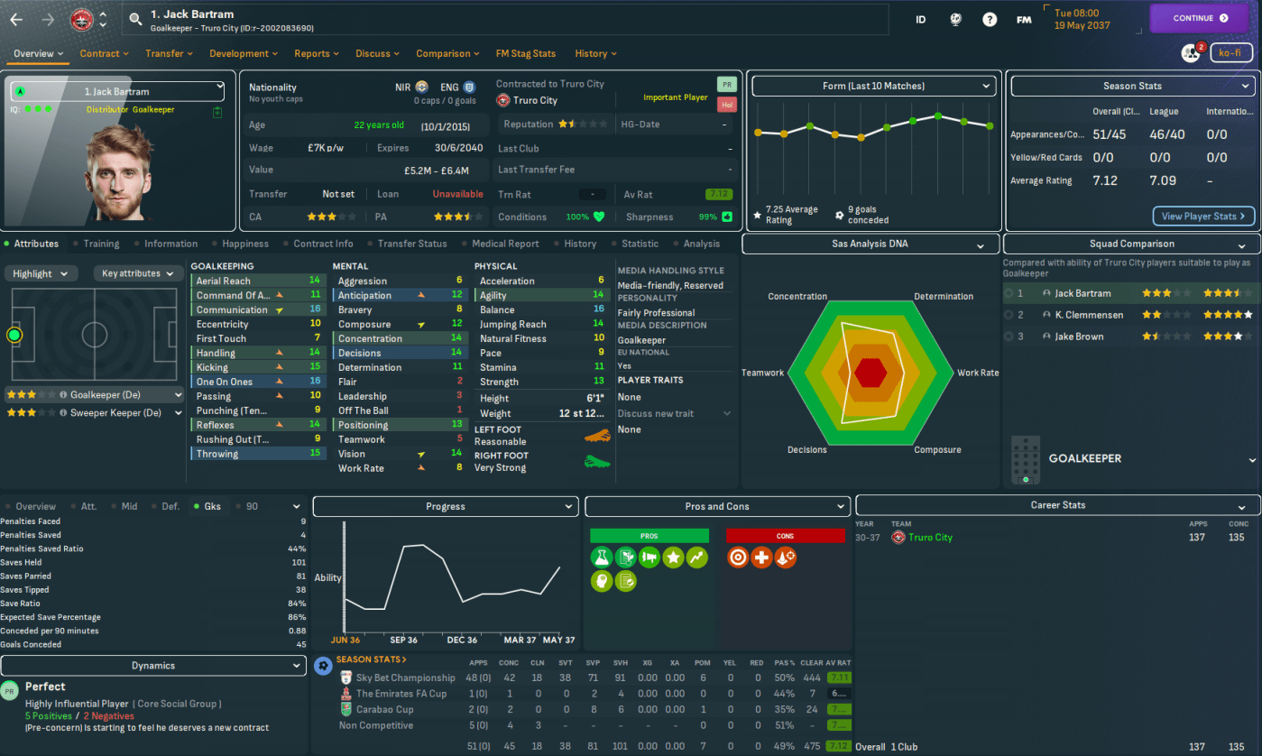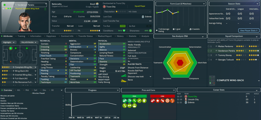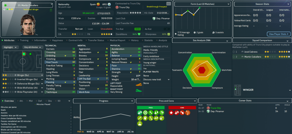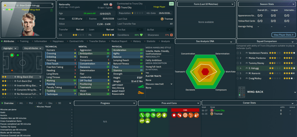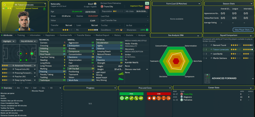 2037 began with a new club record sale as Caballero, who undoubtedly had huge potential but was unlikely to get a work permit for a new contract, joined Napoli for an unrefusable £12.5m. Trevelyan strengthened his squad in January with probably his most exciting signing so far, bringing in Bernard Touré, who needs to retrain as a midfielder, for just £200k from AFAD Plateau. He was joined by Truro’s fifth Uruguayan in centre back Gabriel Larrea for £96k from Boston River and left back Stian Endre Valrygg on a free from Tromso. And on deadline day, a little out of desperation to add a striker, he brought in 6ft 4in Taison Lorenzato on loan from Palmeiras.
