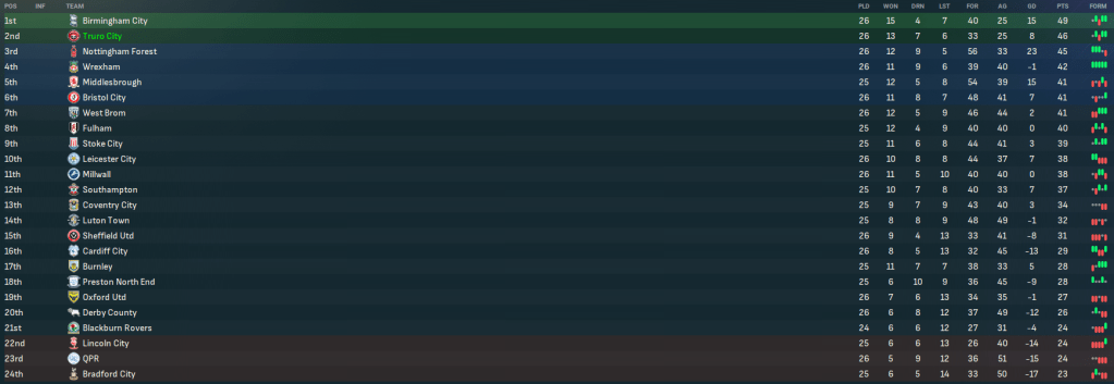 Game 2 – Birmingham City (1st, home): Birmingham could clinch the title with victory at Truro City Stadium. But Truro’s defence held firm in a pretty affair that ended 0-0. Stoke won 5-1 at Oxford, Southampton drew 4-4 at Leicester, Bristol drew 1-1 with Burnley and Forest lost 1-0 at West Brom. Truro’s automatic promotion hopes were now ended, and they sat just 2 points clear of West Brom.