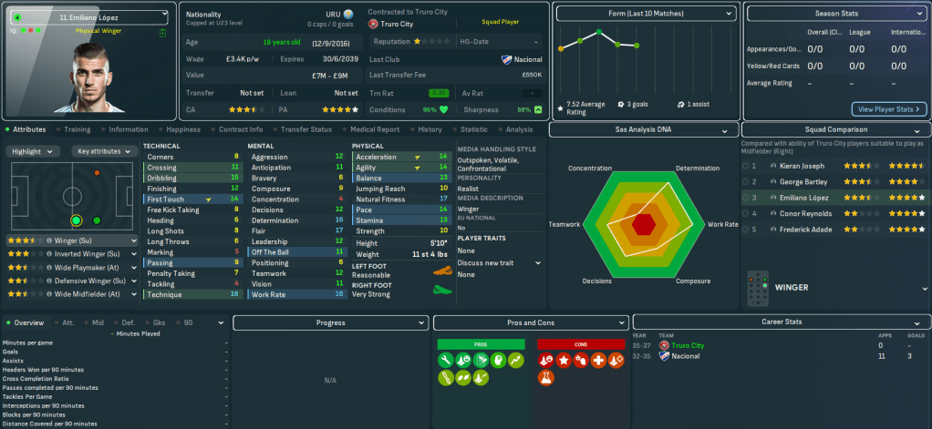 Trevelyan had refrained from spending the £20m or so he’d amassed over the years. But, given last year’s close miss, he decided this was the season to start spending. That began by paying a new club record £550k for Uruguayan winger Emiliano López from Nacional, along with Truro’s first Brazilian in left back Vanderson Pereira after he was released by Gremio and promising winger Martín Caballero on a free from Pinamar. Trevelyan also added experience by snapping up former Inter striker Martín Satriano on a free and loaned in another South American in midfielder Alejandro Silva from Nacional.