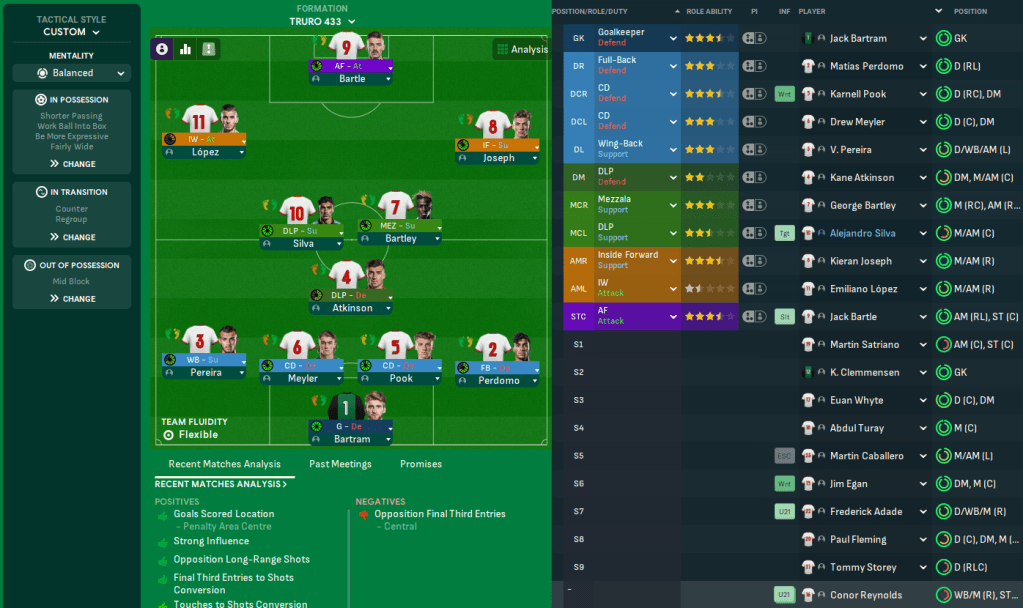 Despite those signings, Trevelyan continued to rely on homegrown prospects in key areas. Jack Bartram continues in goal, Truro-born Karnell Pook, who’s attracted interest from Juventus, steps up as starting centre back alongside captain Drew Meyler with competition from Falmouth-born Euan Whyte, 17-year-old Kane Atkinson comes into the holding role behind vice-captain George Bartley, and the backups include seven players who came through the Truro academy. Pereira’s arrival sees Matías Perdomo move out to the right, backed up by 17-year-old Frederick Abade, and Jack Bartle moves up front to allow López to play on the left. However, while he stuck with his 4-3-3, the manager had begun quietly training a 3-5-2 system that would require several players to retrain positions.