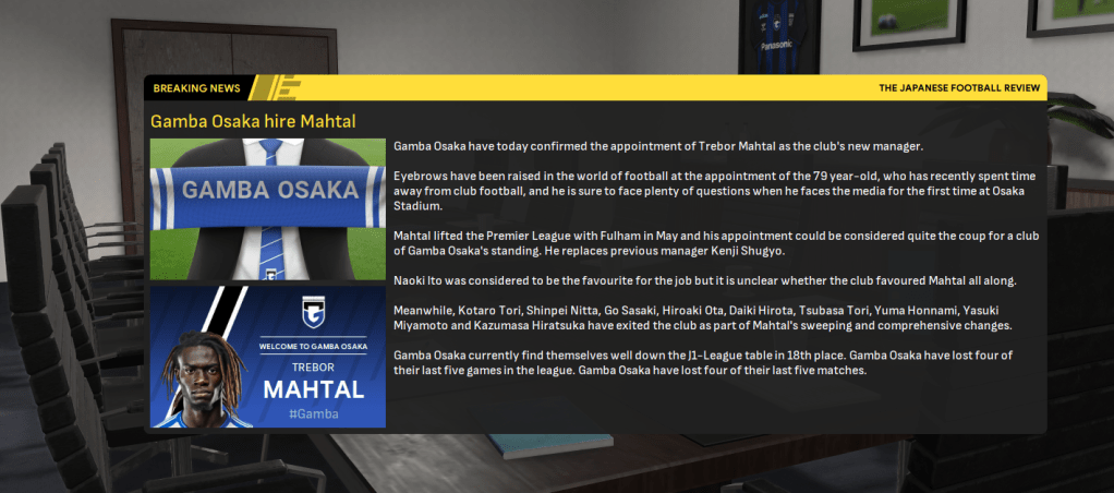 That meant the letters now eluding him were: C, D, G, H, I, K and X. Upon resigning, only two clubs that began with those letters had vacancies – one of which was in the newly unlocked Japan. Said Japanese side jumped at the chance to interview Mahtal and, a few days later, offered him the vacant position. And Mahtal jumped at the chance to return to Asia for the first time since leaving Perak in 2032.