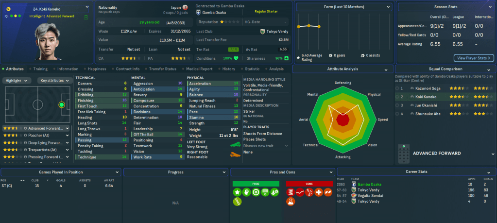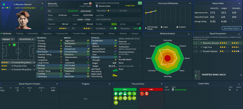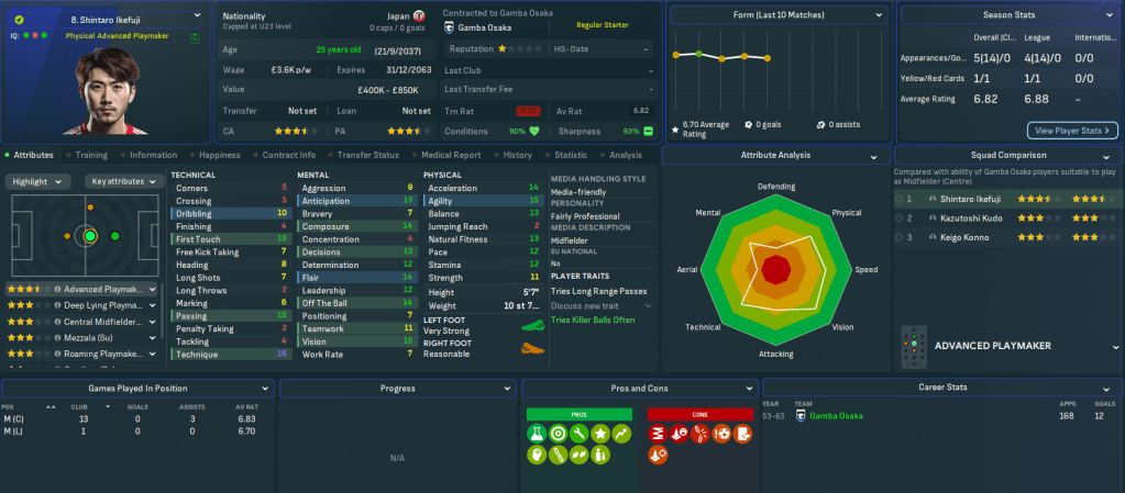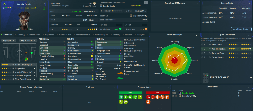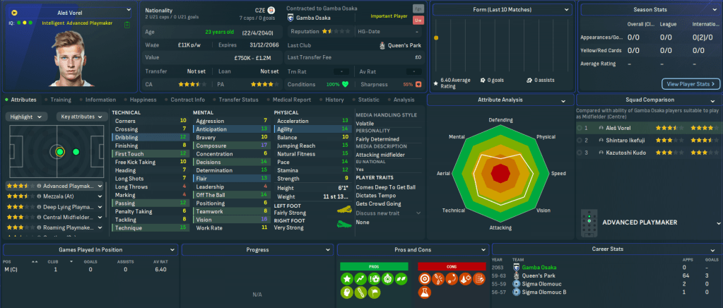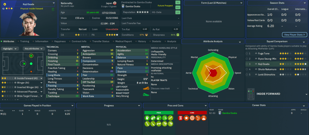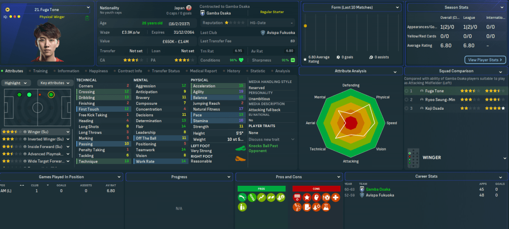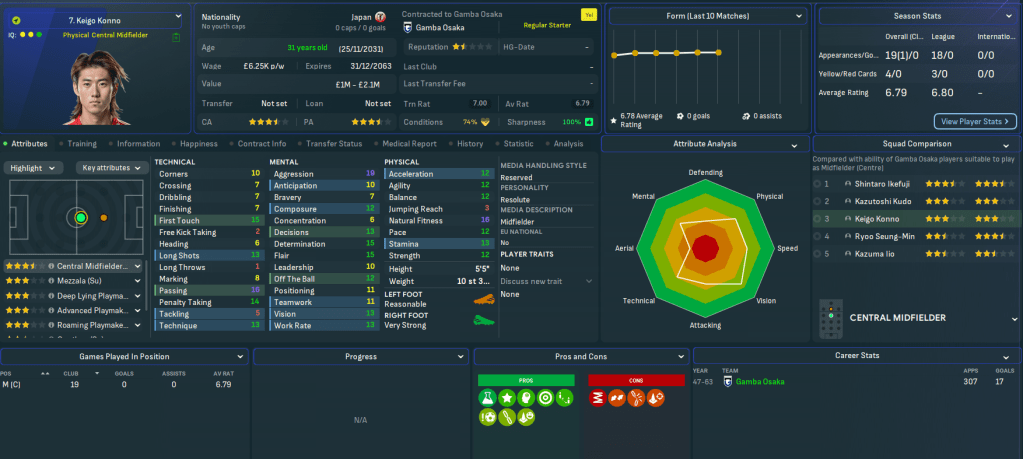 The best player at Gamba is winger Sena Tobori, along with Korean centre back and captain Jung Won-Jin and midfielder Shintaro Ikefuji. Oddly, they had two good left backs, Mitsuhiro Okanishi and Fuga Tone, and two good right backs, Kenta Yokouchi and Kyohei Yamamoto, along with midfielder Keigo Konno and striker Koki Kaneko. They also had a few decent youngsters to keep an eye on, led by 16-year-old goalkeeper Yosihiro Michiue, striker Hitoshi Shimazaki, midfielder Koji Osada and full back Hayato Tominaga, who Mahtal would be looking to give first-team minutes. Mahtal added to that by bringing in his former Queen’s Park midfielder Ales Vorel, who’d just been released, and later added promising South African striker Wandile Fortuin for £200k from Cape Town City.