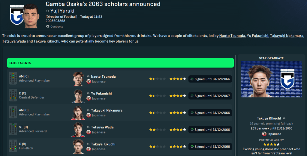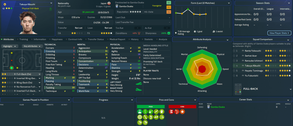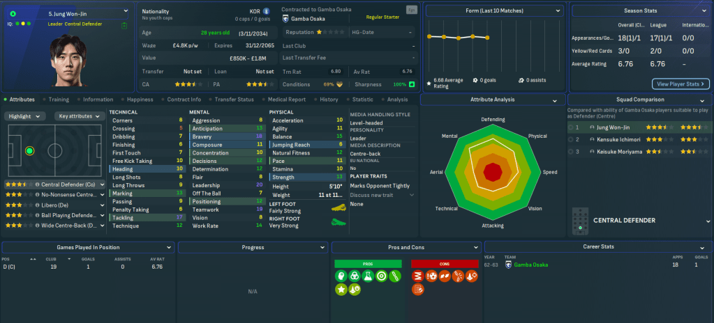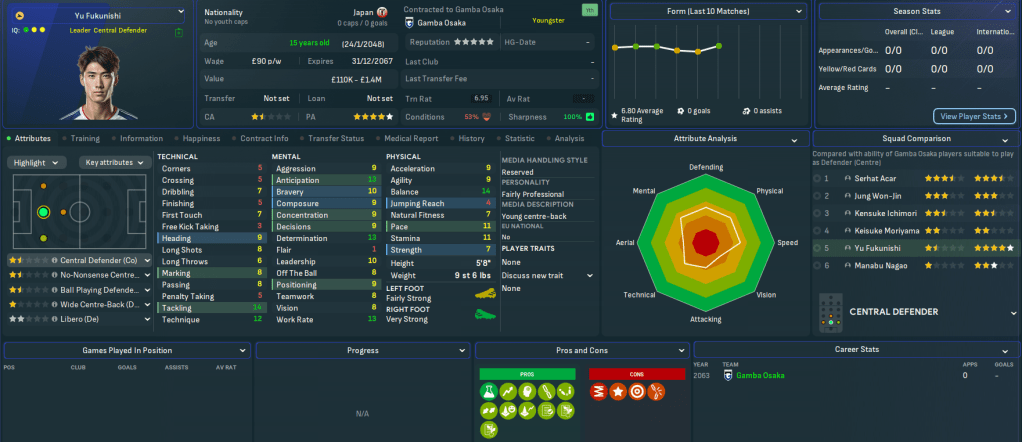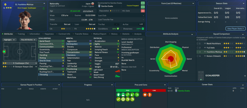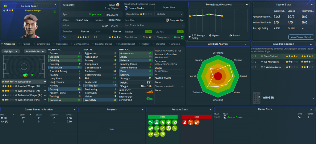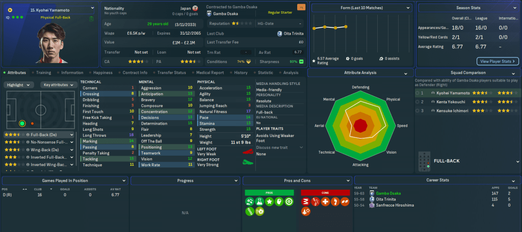 The best player at Gamba is winger Sena Tobori, along with Korean centre back and captain Jung Won-Jin and midfielder Shintaro Ikefuji. Oddly, they had two good left backs, Mitsuhiro Okanishi and Fuga Tone, and two good right backs, Kenta Yokouchi and Kyohei Yamamoto, along with midfielder Keigo Konno and striker Koki Kaneko. They also had a few decent youngsters to keep an eye on, led by 16-year-old goalkeeper Yosihiro Michiue, striker Hitoshi Shimazaki, midfielder Koji Osada and full back Hayato Tominaga, who Mahtal would be looking to give first-team minutes. Mahtal added to that by bringing in his former Queen’s Park midfielder Ales Vorel, who’d just been released, and later added promising South African striker Wandile Fortuin for £200k from Cape Town City.