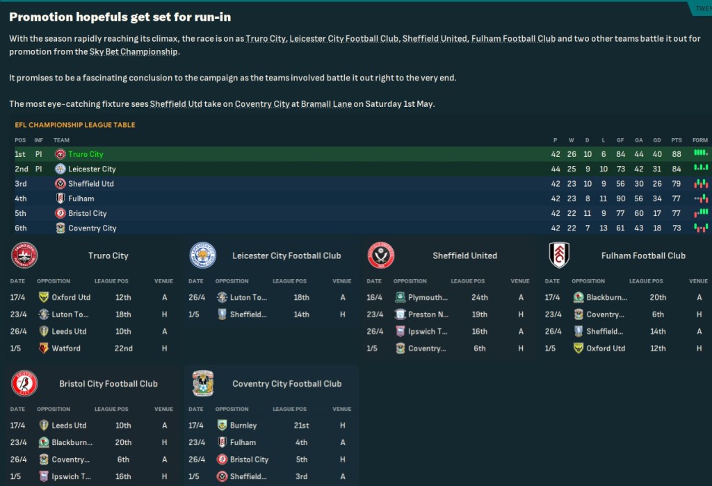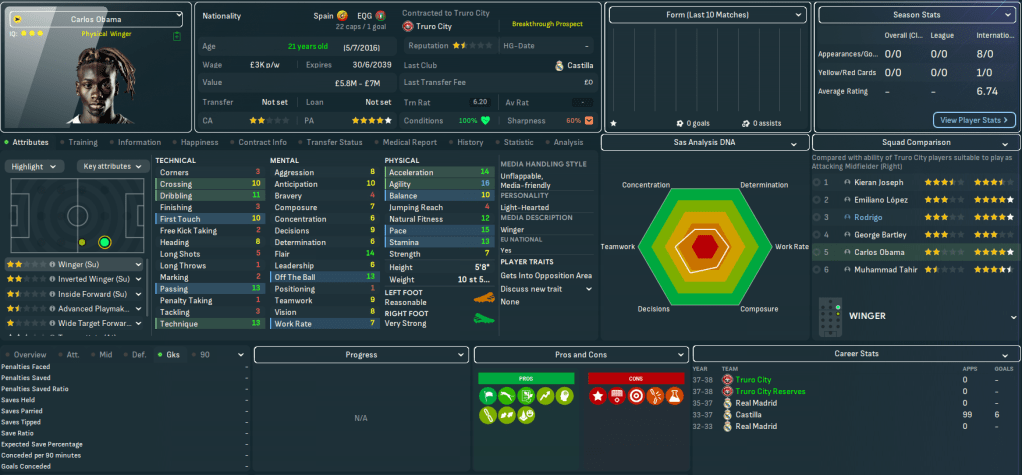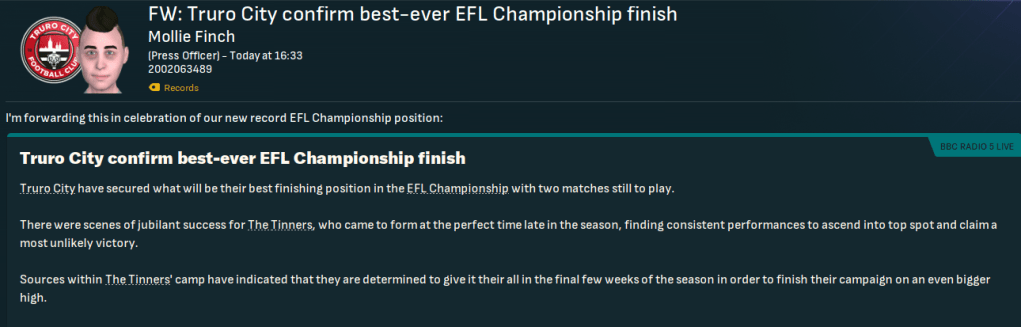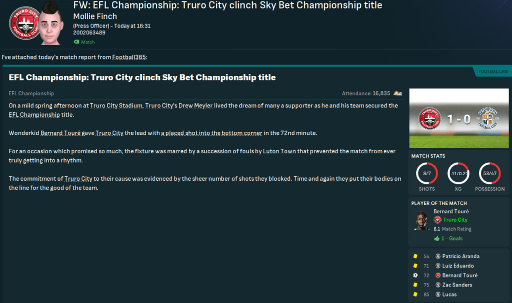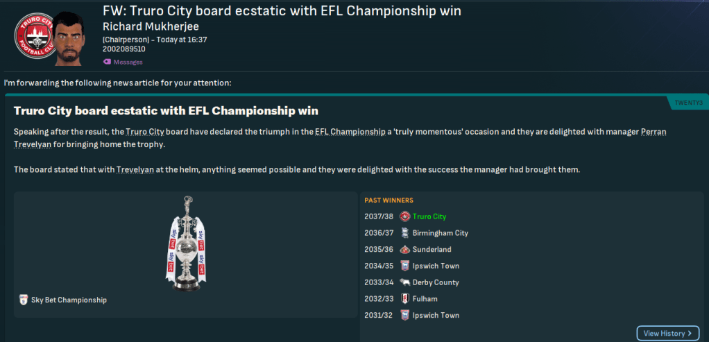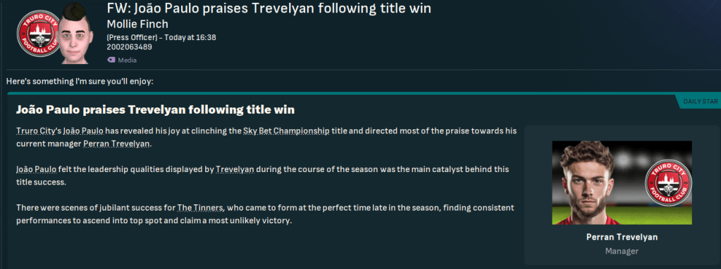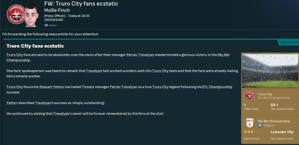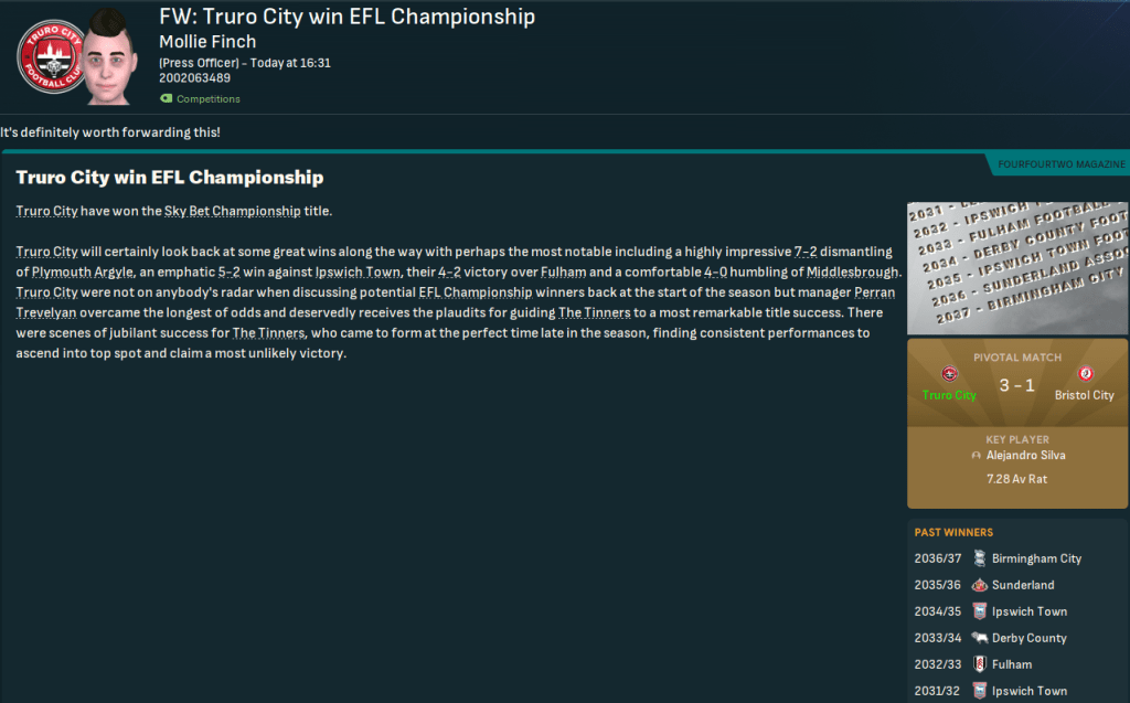 Trevelyan was the talk of Truro as he and his exciting young squad paraded the Championship trophy around the city on an open-top bus tour. The title saw Trevelyan finally named as a legendary figure in truro history, alongside his former striker and assistant Stewart Yetton and former backroom staff members Ian Leigh and Deba Siddhu. Indeed, that trophy was their first league title since winning the Vanarama National League 11 years ago and their first trophy win since winning the EFL Cup in 2031. Truro finished the campaign with five wonderkids among their ranks, with Silva, Paulo and Touré later joined by defensive duo Parra and Larrea.