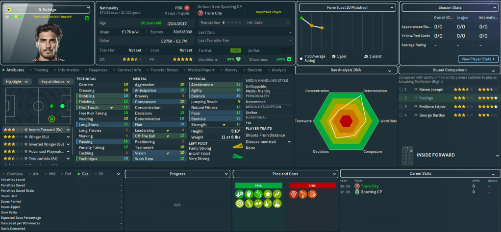 The new formation continued to surprisingly deliver more goals at both ends. Akinde got his first senior goal in a strong 4-2 win at home to Fulham, Silva stole the show with two goals and an assist in a 3-1 win over struggling Burnley, and Truro’s players made the Ipswich manager, who accused them of “not being direct enough,” eat his words with a thumping 5-2 home win. They had a few struggles on the road, but imperious home form sent Truro top of the Championship for the first time this season in mid-November. And they maintained that position led by the relentless form of Rodrigo, who scored in all six games in December and got 10 goals in the final eight games of 2037. That earned Truro a 5-point lead over Fulham and Sheff U heading into the new year.