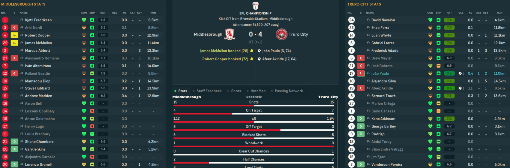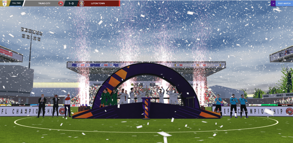 Game 2 – Luton Town (15th, home): Truro could seal promotion with just a point at home to Luton and clinch the title with a win. You wouldn’t have known it based on their first half performance in a really poor match. But a rally cry at halftime livened things up and Touré went close with a freekick before Silva sent him in for the opener. Nothing else happened and Trevelyan killed the game off for a 1-0 win.