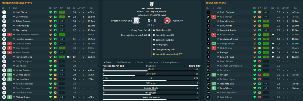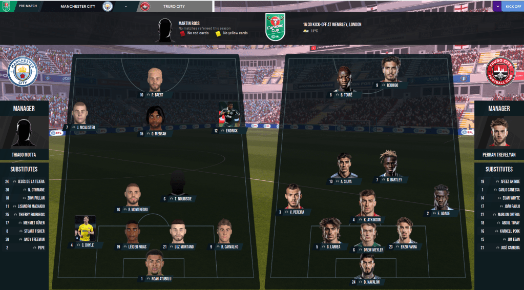 Truro got the better half of the semi-final draw against Southampton while Brighton faced Man City. The home leg was up first and Truro put in a solid defensive effort to nullify Southampton and Bartley smashed home the only goal. They got a rare week off between the legs, while Southampton had to play an FA Cup game against Oxford, and the away leg marked Trevelyan’s 800th match in charge of Truro. And the extra fitness counted as, despite Southampton levelling things up in first-half injury time, Atkinson and Turay strikes put Truro through 3-1 on aggregate. And Truro were going to a major cup final!