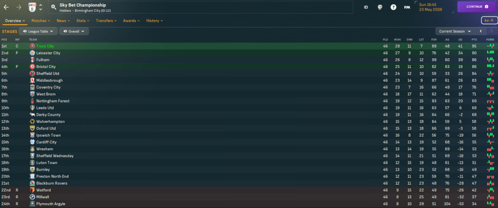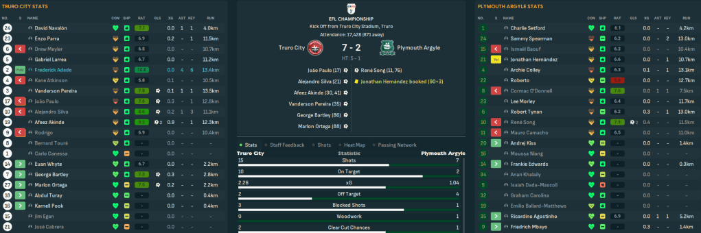 They wrapped up the season with a rotated team losing 3-2 at Leeds before Silva scored the only goal at home to relegated Watford. That saw Truro top the pile with 95 points after 28 wins, 11 draws and 7 defeats, scoring 89 and conceding 48. Silva and Navalón were the 2nd and 3rd best players in the league with 7.30 and 7.24 average ratings respectively. Akinde was the 9th top scorer with 16, with Rodrigo and Touré joint 12th with 15 each, but they were miles behind Fulham’s top scorer Daniel Gudjohnsen, who scored 39 in 46. And Silva and Adade were the 4th top assisters with 13 apiece. Silva was named Championship Young Player of the Year and Trevelyan won Manager of the Year, while Meyler, Parra, Adade and Bartley were named in the Team of the Year.