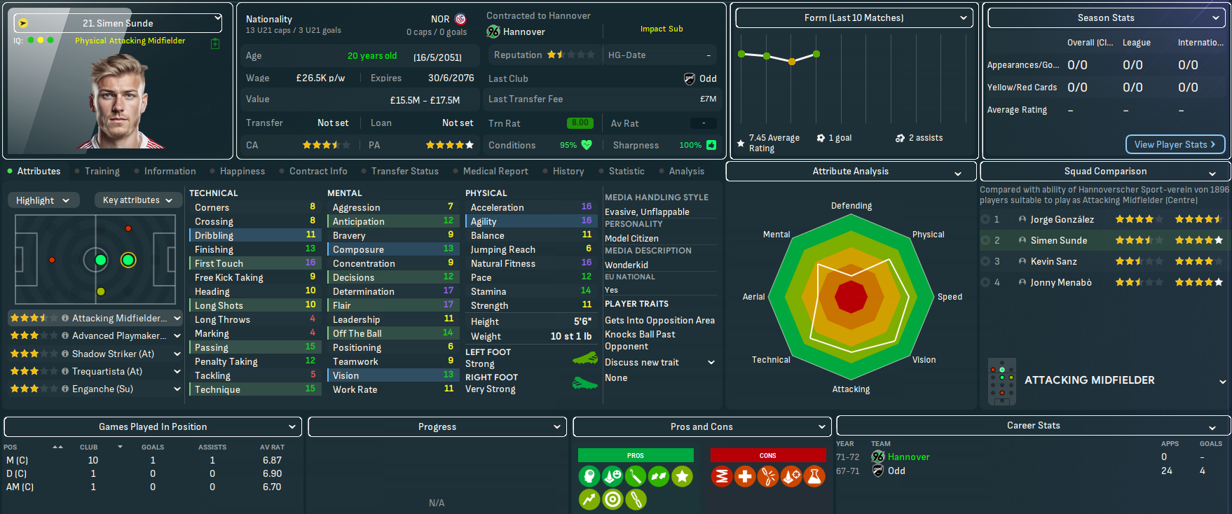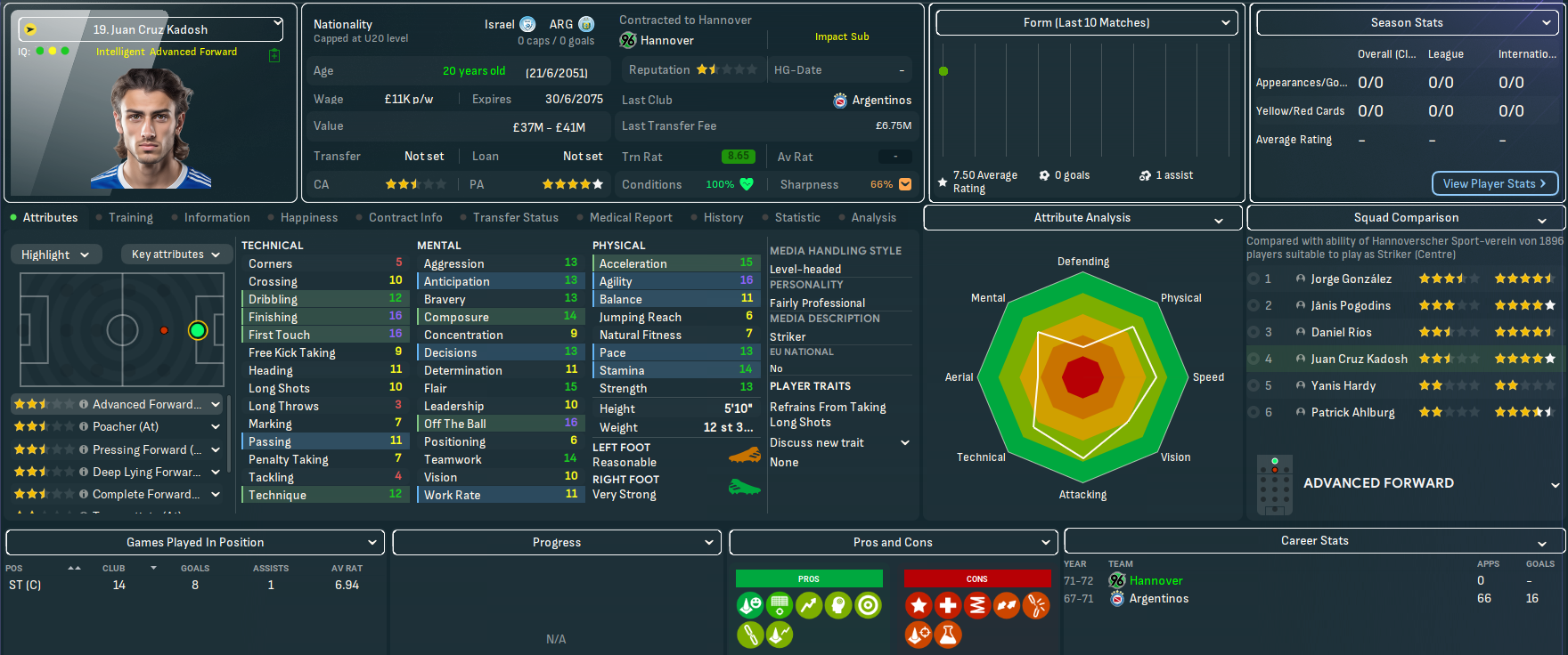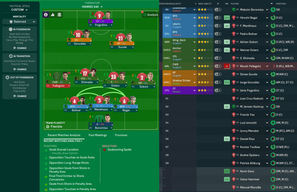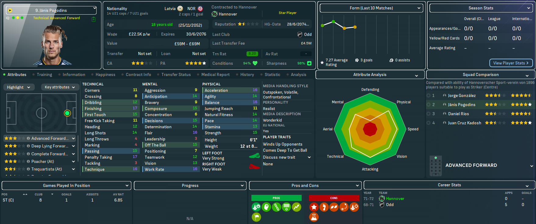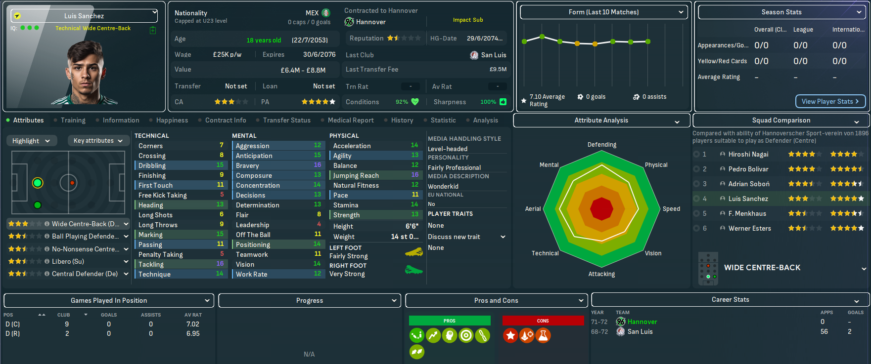 Hannover began the new season with a £76m transfer kitty, which was boosted by selling a few backup players, captain Yanis Hardy to Odd for £11m and midfielder Kevin Sanz to Necaxa for £13m. Mahtal, who was headhunted by FC Bayern over the summer, moved quickly to secure some exciting talents, led by potential superstar Latvian/Norwegian striker Janis Pogodins, who’s been dubbed the next Tore André Flo, for £4.5m from Odd. He was joined by his Odd teammate and model citizen Simen Sunde for £7m, striker Juan Cruz Kadosh, who’s been labelled the next Gabriel Batistuta, for £6.75m from Argentinos, midfielder Luis Iannotti, apparently the next Javier Mascherano, for £5m from Racing, future wing back Andrei Spataru for £4.1m from Politehnica Iasi, wing back Kostas Tsolkas for £4m from Frankfurt and centre back Franck Yao for £250k from ASEC Mimosas. Later, 6ft 6in wonderkid centre back Luis Sánchez rejected the likes of Chelsea to join for £9.5m from San Luis.