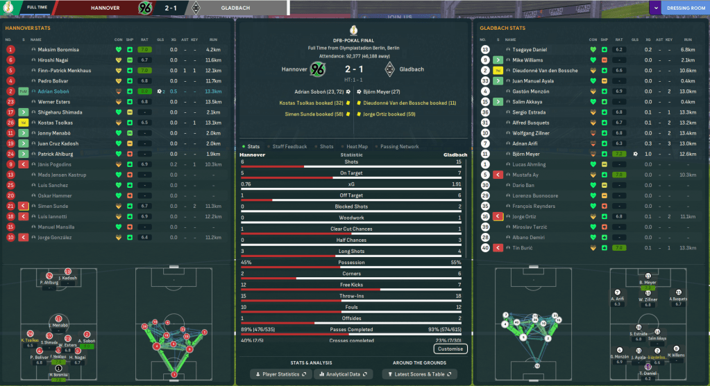 Hannover had the first shot in anger as Sunde fired a free kick over. But struck first as another of his free kicks was skewed across the box by a defender to right wing back Adrian Sobon to head home at the back post, only for Gladbach’s superb striker to immediately equaliser. Gladbach dominated from then on, but against the run of play, got the run on his marker to power home Finn-Patrick Menkhaus’ near-post corner. Gladbach offered nothing until their goalkeeper headed a freekick over the bar in injury time. And Hannover held on for unlikely glory.