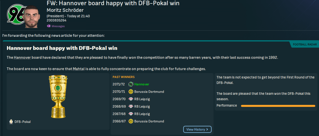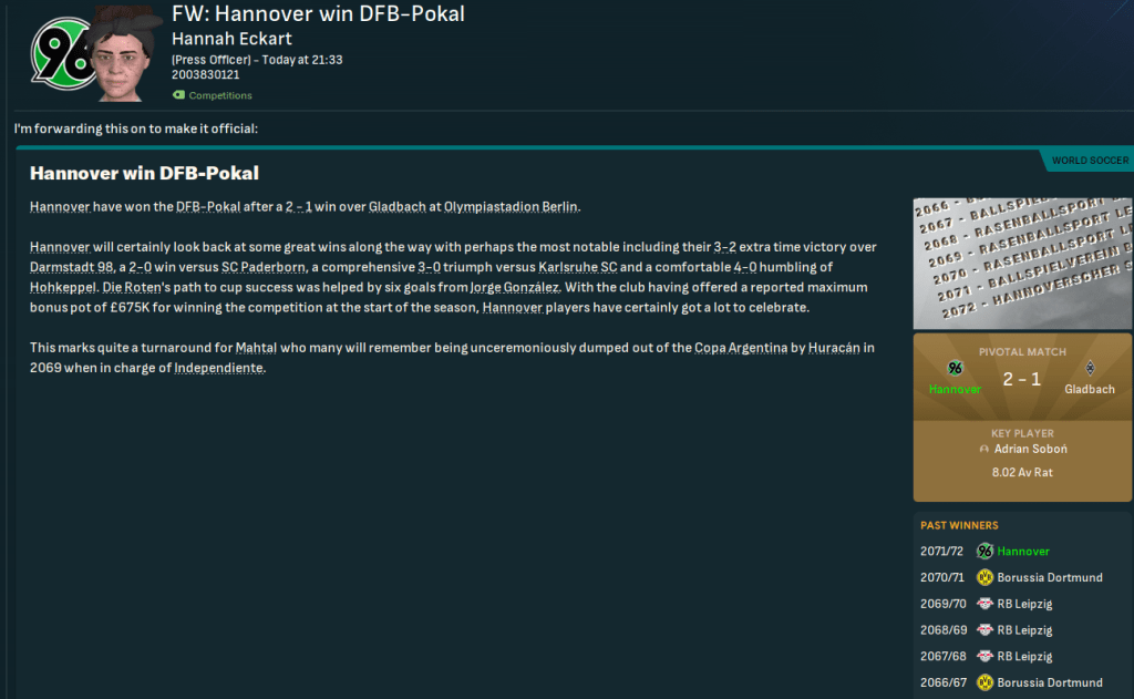 Mahtal knew he was building a really solid team at Hannover, but certainly wasn’t expecting this Pokal success – aided by an extremely unfortunate cup draw. Indeed, the potential was confirmed by Pogodins winning NxGn 2072 with Sanchez 5th, Werner Esters 22nd and Shigeharu Shimada 39th. And, despite the coaches oddly not rating Menkhaus, the 20-year-old made his Germany debut in March, only to get dropped for the Euros after an injury. Furthermore, Mahtal had already made moves for several exciting youngsters to bolster the squad for next season. But now that was completely irrelevant as he ticked H off the list.