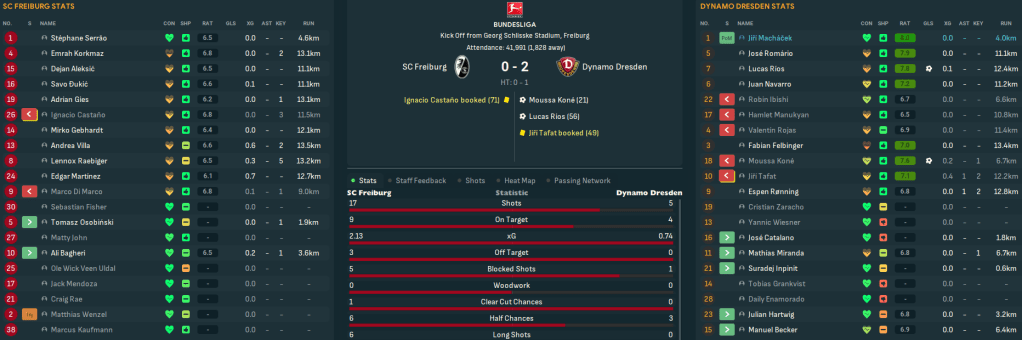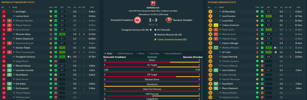 They slipped to an unlucky 3-2 defeat at Hannover but another Romário header to down Augsburg 1-0 saw them leapfrog Mahtal’s former club into 7th with seven games remaining. Ronning annoyingly tore his calf on his Norway debut against New Zealand and missed the rest of the season, and without him they struggled to a 1-0 defeat at Werder. But they found form as a rare Miranda goal nicked a 1-0 win at home to Frankfurt and Ríos and Koné edged a 2-1 win at struggling Wolfsburg to move Dresden 6th with four games remaining. However, the final four games were really tough.