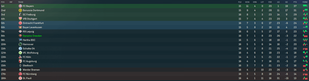 But a tricky December, with consecutive defeats to Wolfsburg, Leipzig, Leverkusen and Dortmund, left Dresden in a very respectable 8th place, 8 points clear of any relegation concerns.