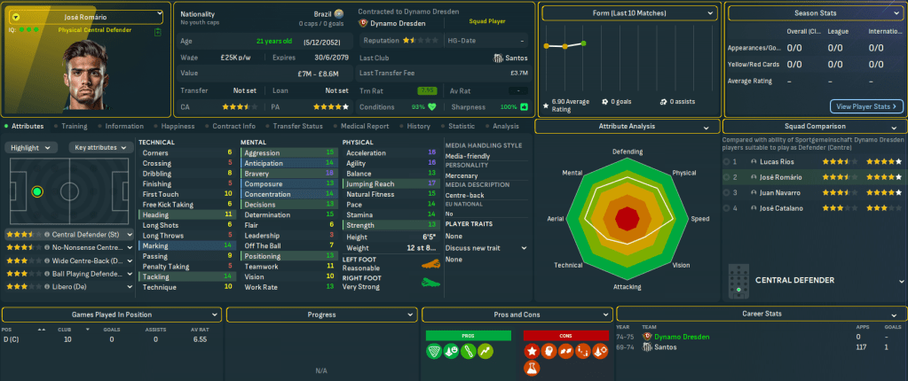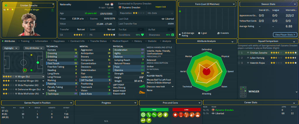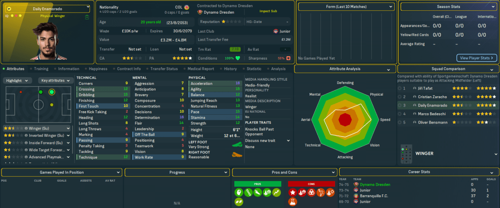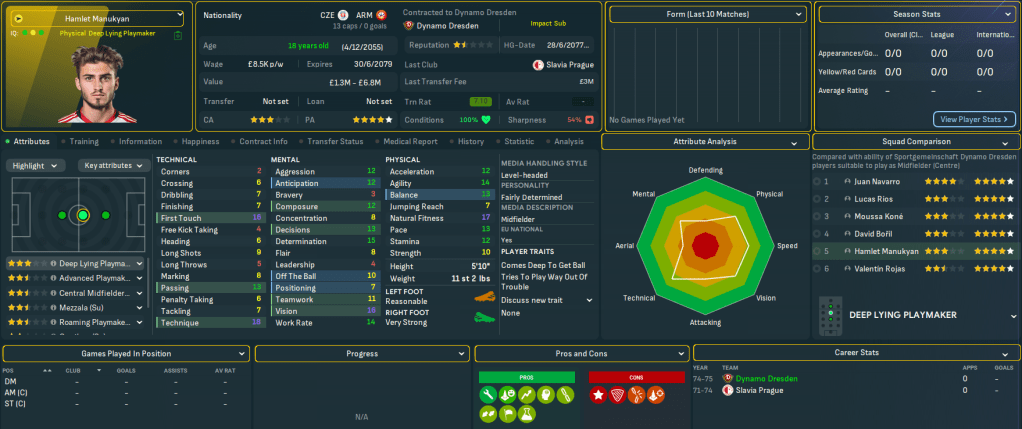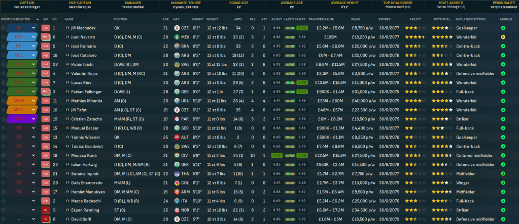 The Baturina move was sanctioned as Mahtal had already found a much better replacement in wonderkid Jiri Tafat for £5.5m from Plzen. Joining him was fellow wonderkid midfielder Lucas Ríos for what should become a club record £10m from Newell’s Old Boys and three more midfielders in Diego Reyes for £1.5m from Tijuana, Hamlet Manukyan for £3m from Slavia Prague and Lautaro Jiménez for just £40k from Talleres. Mahtal also strengthened his defensive options with José Romário, who’s 6ft 5in with 17 jumping reach and 16 acceleration, for £3.7m from Santos and pacey Daily Enamorado, who’ll retrain as a left back, for £1.2m from Junior before adding backup striker Cristian Zaracho for £925k from Libertad.