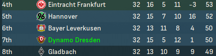 Dresden continued to impress as Machacek’s four saves earned a 0-0 at home to leaders Dortmund in the penultimate game of the season. And a big final day clash saw 7th-place Dresden visit 6th-place usurped champions Gladbach, and their uptorn in form continued as another solid defensive showing was backed up by Miranda chipping in a delicious 71st-minute winner.