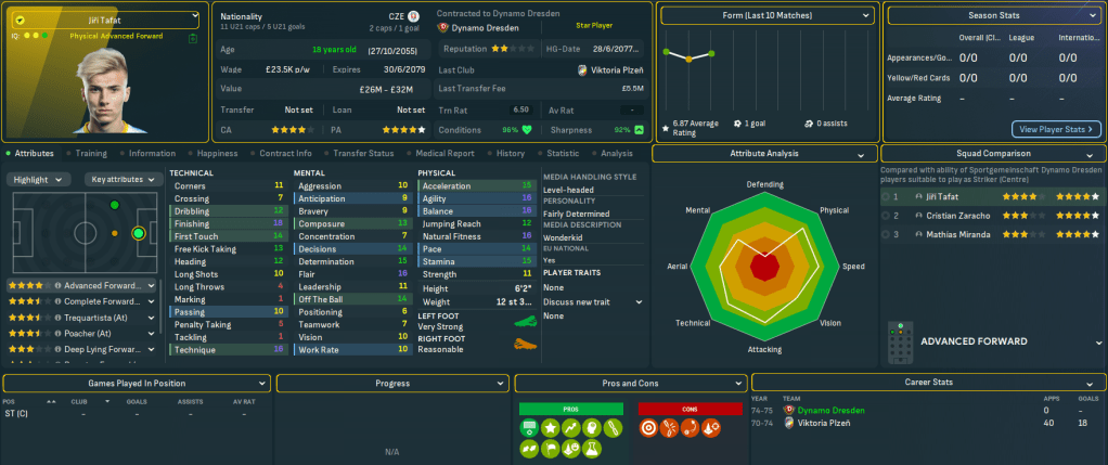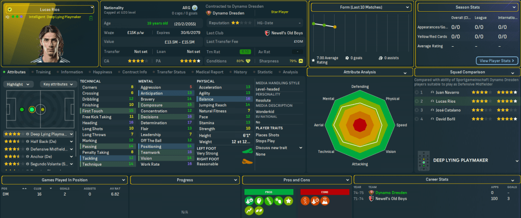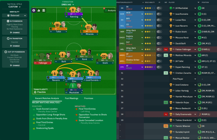 The squad now contains 16 players with up to 5-star potential and four wonderkids, so Mahtal was excited about their prospects. He initially stuck with the narrow 4-3-3 but toyed between using that and the 3-4-3 he used at Hannover, with Tafat retraining to play as the shadow striker in behind Ronning, Moussa Koné dropping deeper, and Romário and Ríos forming a solid partnership with Mexico international Juan Navarro, who was named in the 2074 World Cup Dream Team.